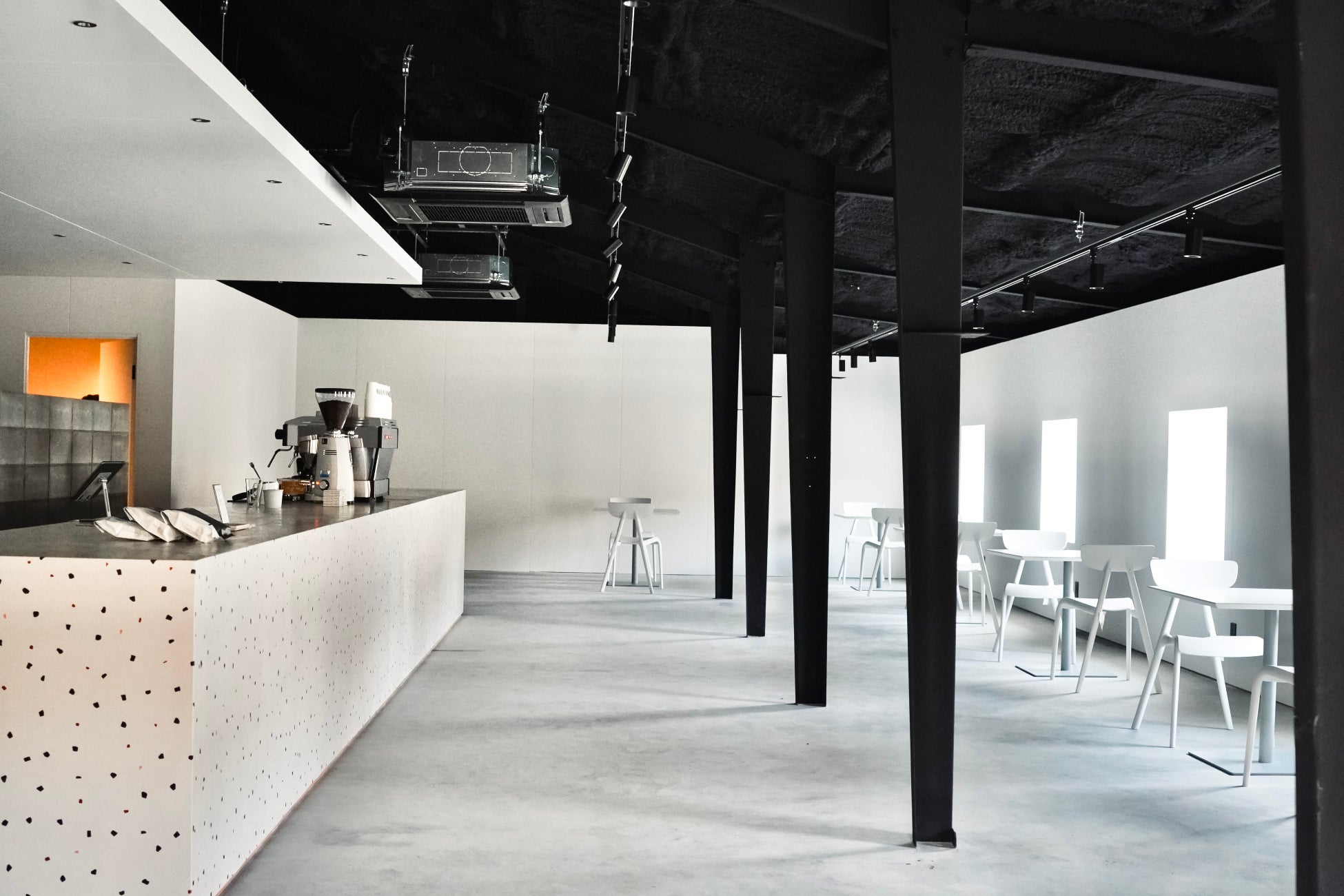 店内は白を基調とした空間で、黒い柱はもともとあったものを活かしてアクセントに。広々とした場所でゆったりと食事やコーヒー、スイーツ等を楽しむことができます。エスプレッソマシンはイタリアに本社がある「LA MARZOCCO(ラ・マルゾッコ)」。メニューはエスプレッソを使用したドリンクに加え、コーヒー以外のシーズナルドリンクとともにスイーツやお食事も提供します。
