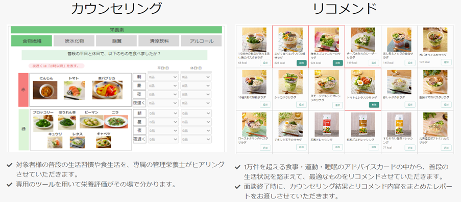 保健指導はカウンセリング⇒リコメンドの流れで行います。カウンセリングの段階で日常生活や、食事・運動・睡眠などの生活状況の振り返りを通じて心理面の評価及び生活面の評価を行います1)。その結果を踏まえて行うリコメンドについては、1万件を超える食事・運動・睡眠のアドバイスカードの中から、対象者の普段の生活状況を踏まえて、最適なものをリコメンドします2)。