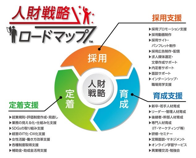 「⼈財戦略ロードマップ」は、様々な課題の道筋を明確にするためのツールとして、経営者とのヒアリングを通じて単年度計画・5 年間計画のロードマップを作成します。これにより⼈材に関する課題が明確となり「いつまでに何をすれば良いか」を⾒える化できるようになります。地域の中⼩企業が抱える⼈材の課題を解決するため、両社の得意分野を活かして協⼒し、採⽤、育成、定着をロードマップに準じてワンストップで⽀援します。