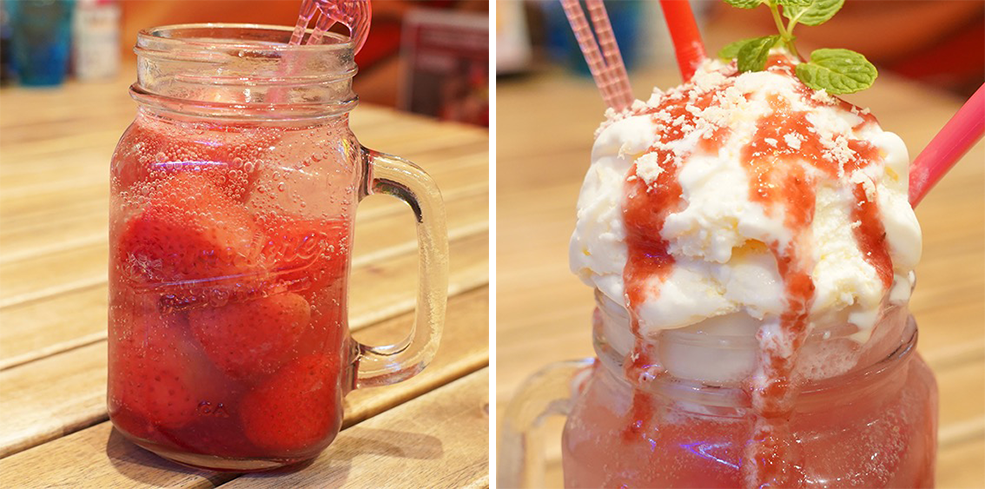 いちごが10個以上丸ごとゴロっと入ったいちごソーダや、カレー屋ならではの自家製チャイやラッシーなど