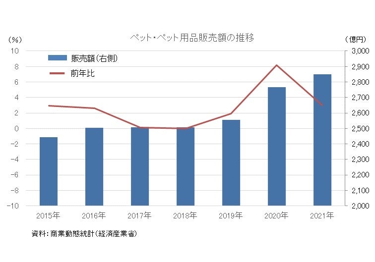 「コロナ禍でもペット・ペット用品の販売額は堅調」ペット・ペット用品については、様々な業態から購入する機会がありますが、品目を限定して商品販売額の動向を見られるホームセンターでの販売額をみてみると、近年、増加傾向を示しています。特に新型コロナウイルス感染症が拡大した2020年に増加額が大きく、前年比8.2%増と大幅に増加しました。
