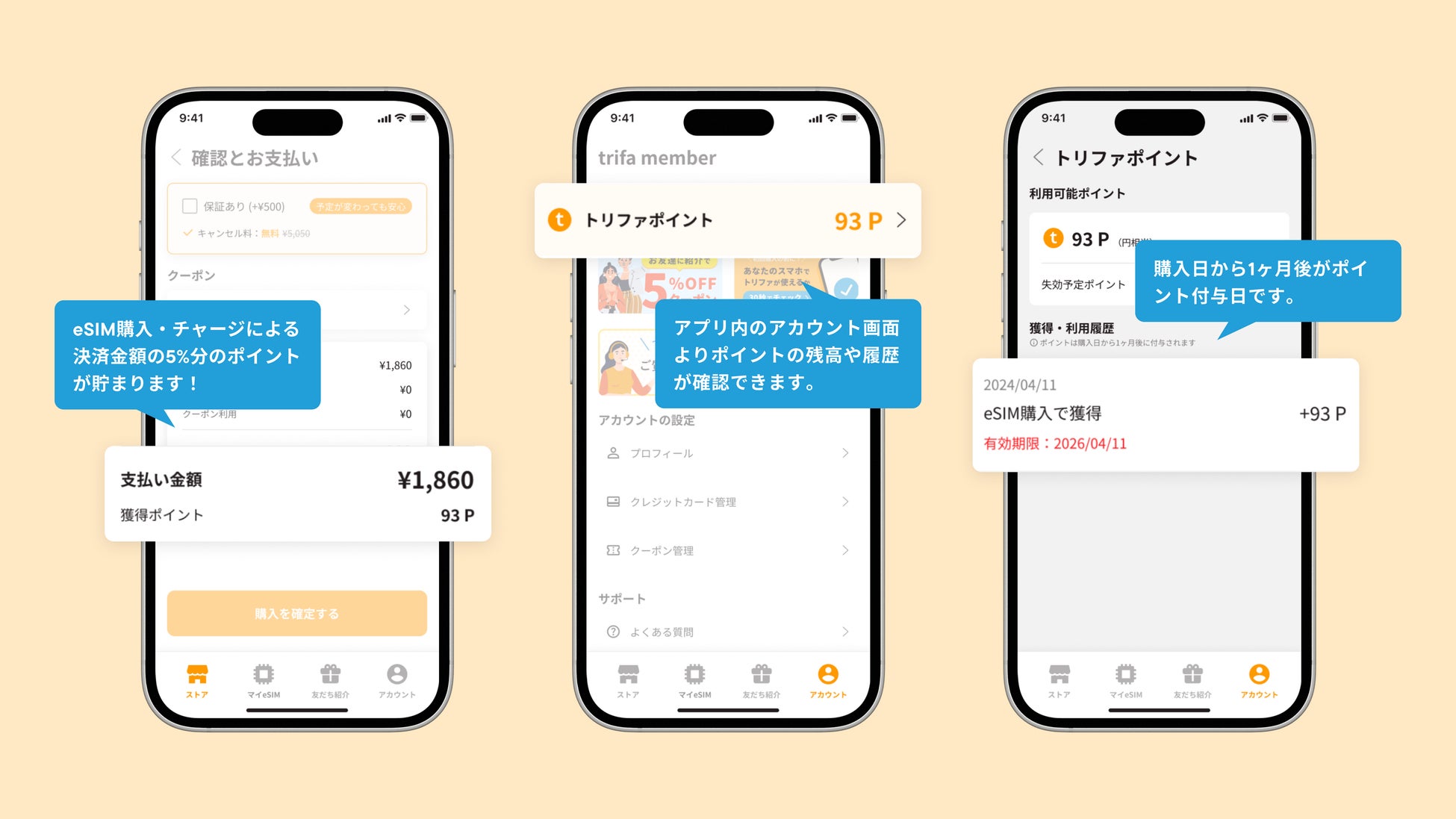 トリファで購入したeSIMやチャージによる「決済金額の5%分」のポイントがたまります。購入日から1ヶ月後がポイント付与日です。ポイントの残高や履歴は、アプリ内のアカウント画面より確認可能です。