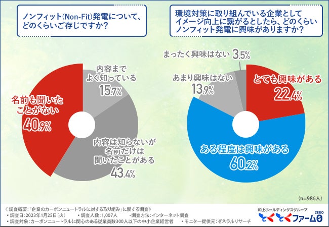 先程の質問で『(積極的に、ある程度は)取り組んでいきたい』と回答した方に、「ノンフィット(Non-Fit)発電について、どのくらいご存じですか?」と質問したところ、『内容までよく知っている(15.7%)』『内容は知らないが名前だけは聞いたことがある(43.4%)』『名前も聞いたことがない(40.9%)』という回答結果になりました。