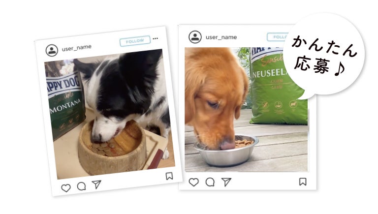 ハッピードッグ・ハッピーキャットのフードを美味しそうに食べている愛犬・愛猫の写真または動画を、ぜひお好きなSNSで投稿してご参加ください!