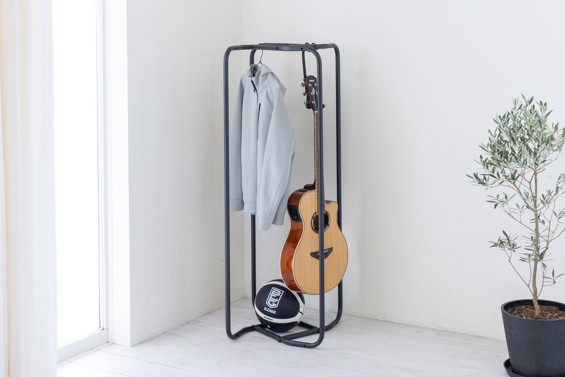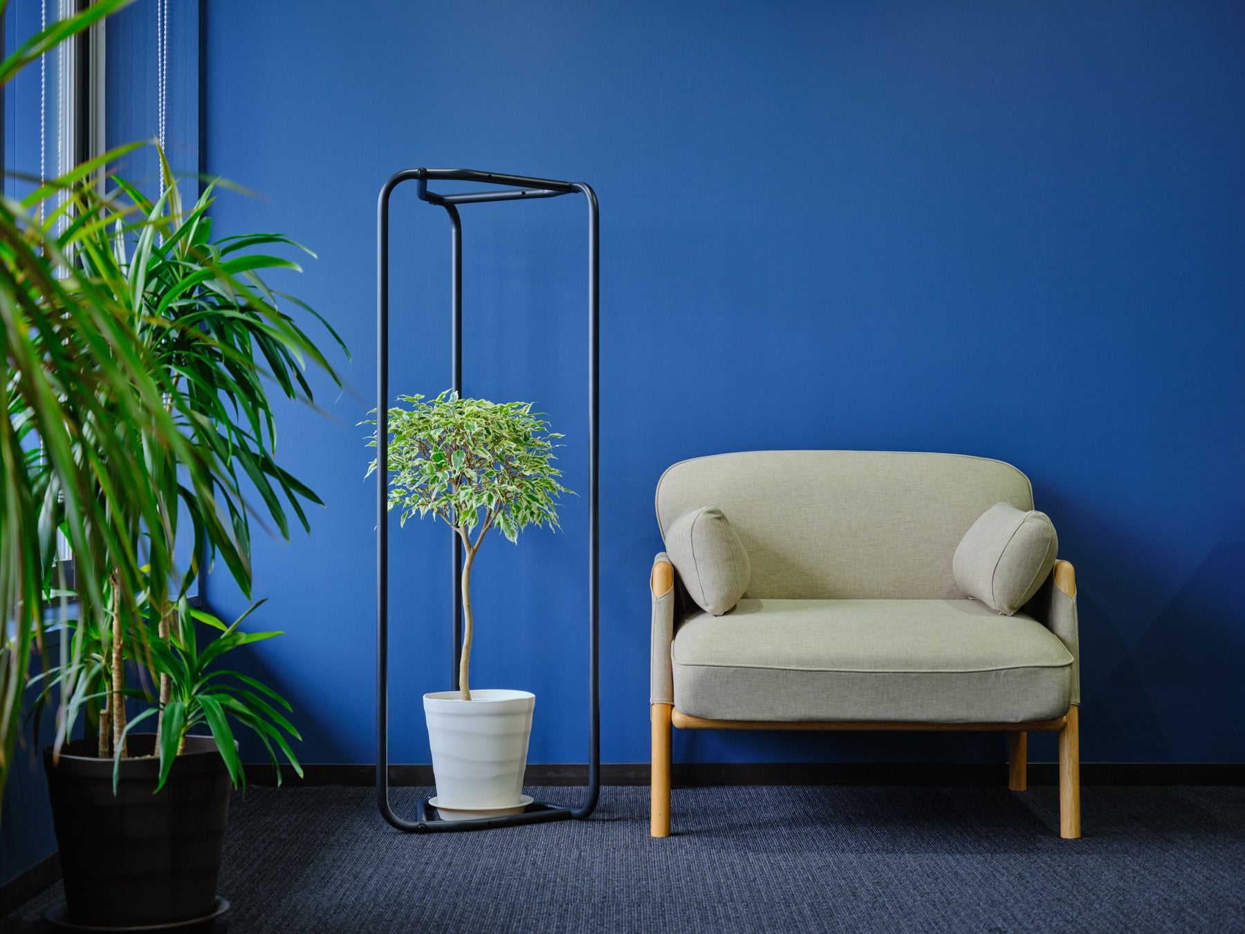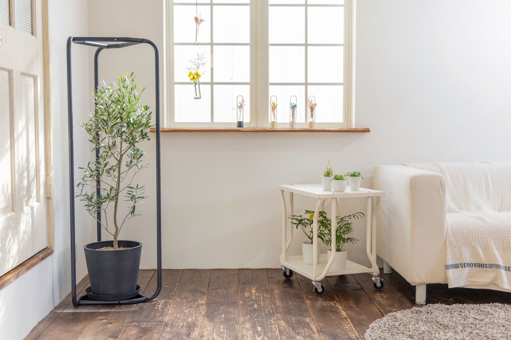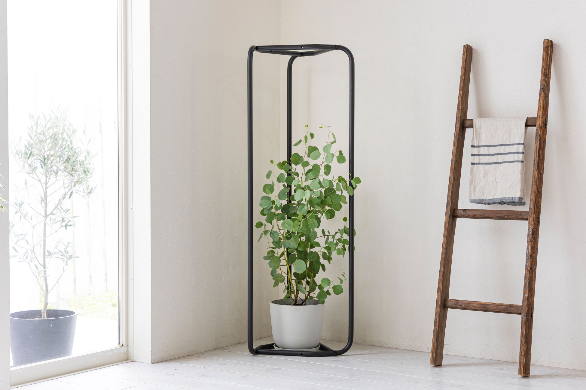 パイプ3本による直線的でシンプルな構造が植物を引き立てます。植物をただ飾るだけでなく、空間に洗練された彩りを与えるアイテムです。