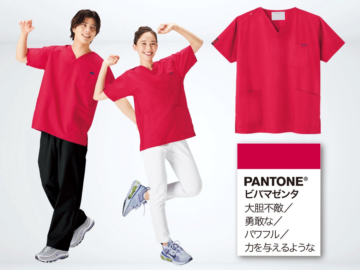 白衣業界最多の色展開を誇る「PANTONE」シリーズは、色自身が持つ印象や意味からも着用者のモチベーションアップやチームの絆づくりのサポートをしており、カラー・オブ・ザ・イヤーの新商品は毎年の恒例となっています。「PANTONE」 7000SCスクラブはビバマゼンタを追加し、2023年で30色のカラーが揃います。