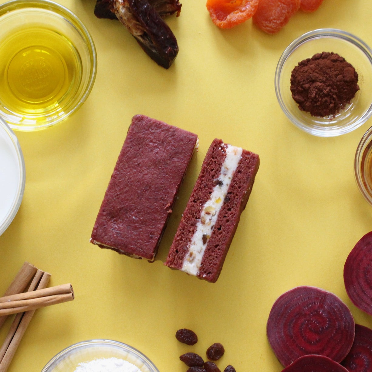 「食べる輸血」とも言われるほど鉄分豊富な「ビーツ」や、食物繊維をはじめとしたミネラル豊富なスーパーフード「デーツ」、アプリコットやいちじくなどのフルーツをふんだんに使用した真っ赤なケーキ。