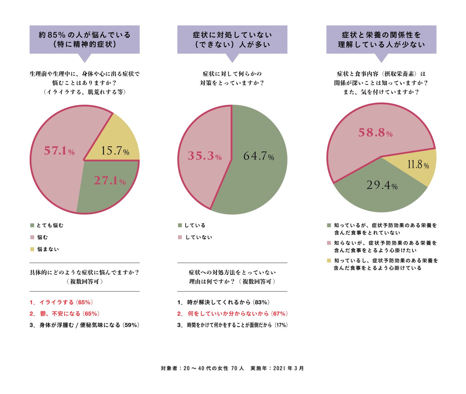 「PMSと摂取栄養素には相関性がある」という研究結果がありながらも、「PMSと食事内容(摂取栄養素)の関係性について知らない」と回答した人は60%以上(2021年3月 MOON TREATS実施調査より)にのぼっています。