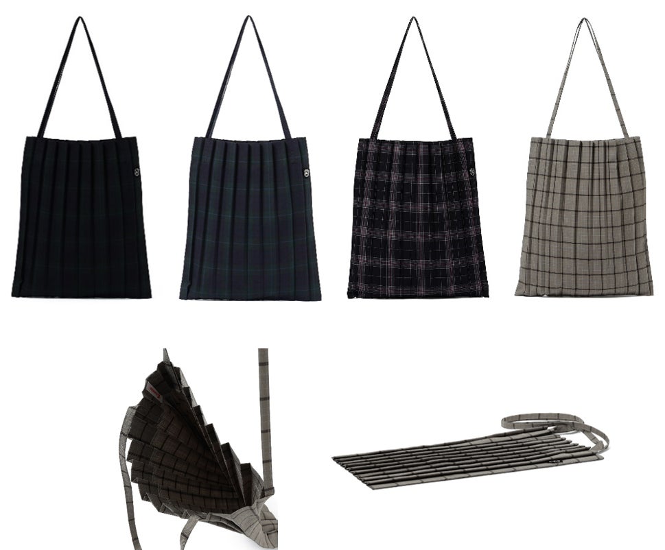 学生服のスカートのようなプリーツを施したトートバッグ。A4サイズが入る大きさで、荷物を入れるとアコーディオンのように広がります。持ち手は肩から掛けてもちょうど良い長さです。
