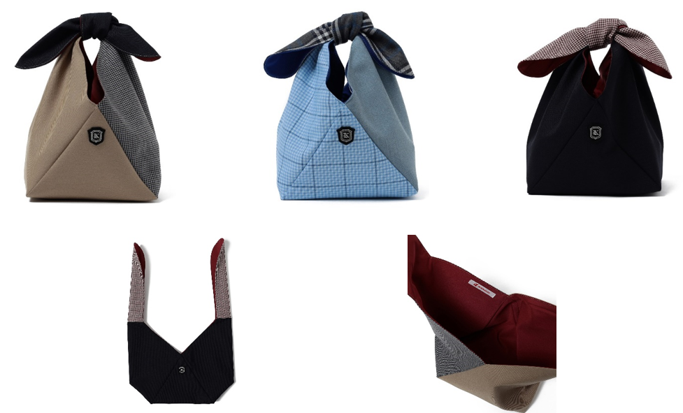 結び目がリボンのようで、ほどくとウサギのように見えるランチバッグ。袋部分と持ち手部分で別の生地を使用し、袋の無地部分=ブレザー、袋の柄部分=ボトム、結び目=ネクタイ/リボンという、学生服のコーディネートをイメージしています。