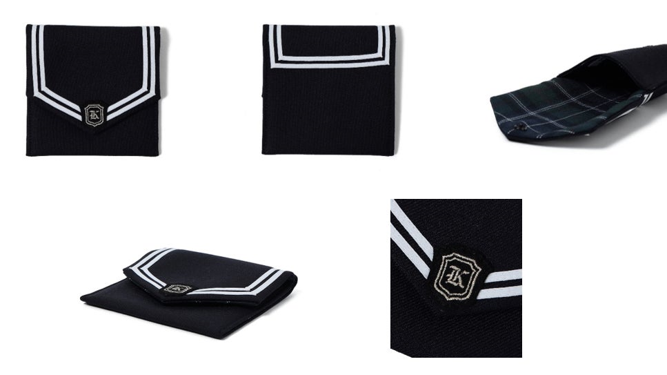セーラー服をイメージしたポケット型のポーチ。表地はセーラーらしい紺無地にセーラーライン、内側には学生服ならではのタータンチェック生地を使用しました。