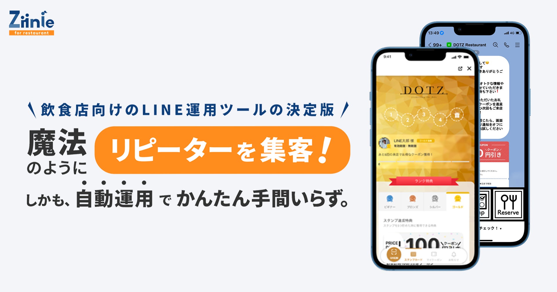 DX推進・マーケティング戦略カンパニーのDOTZ株式会社(本社:東京都渋谷区、代表取締役社長:稲益 仁 以下、「DOTZ」)は、2022年10月3日より飲食店向けLINE自動運用ツール「Ziinie(ジーニー)for Restaurant」の先行予約を開始します。ユーザーへのサービス提供は11月1日を予定しています。