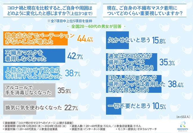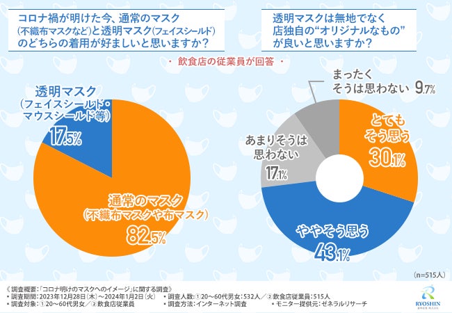 そこで今回、透明マスク『マスクリア』(https://www.ryoshin.com/service/masclear/)を販売する菱神産業株式会社(https://www.ryoshin.com)は、全国20~60代の男女と飲食店の従業員を対象に「コロナ明けのマスクへのイメージ」に関する調査を実施しました。