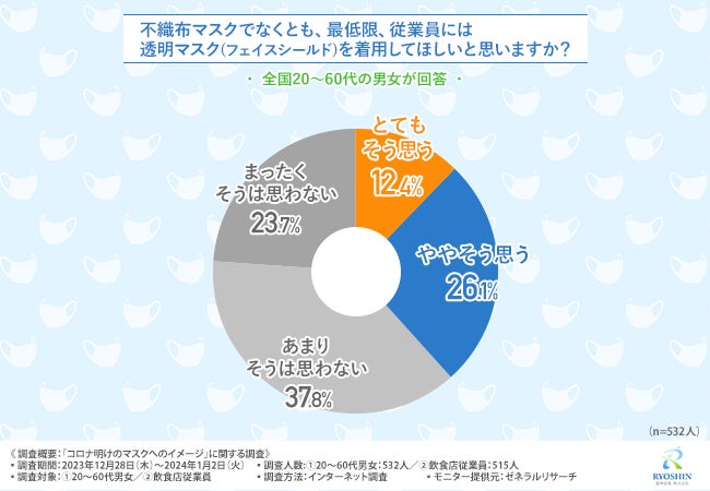 今回の調査で、20代~60代男女の約4割が、コロナ禍が終わっても飲食店の従業員にはマスクを着用して欲しいと感じていることが明らかになりました。