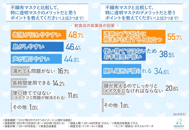 飲食店の従業員の立場からすると、透明マスクは表情が伝わりやすく声が通りやすいことをメリットと感じている方が多いことが示されました。