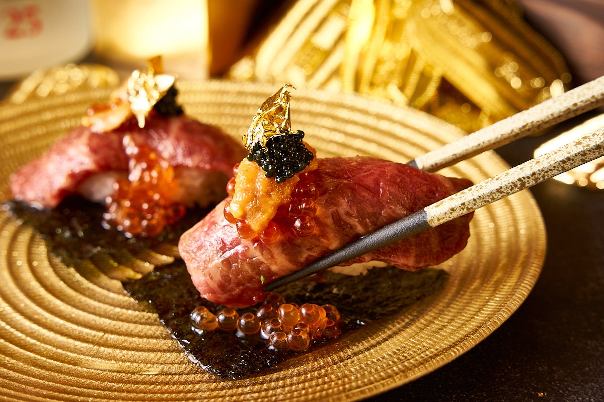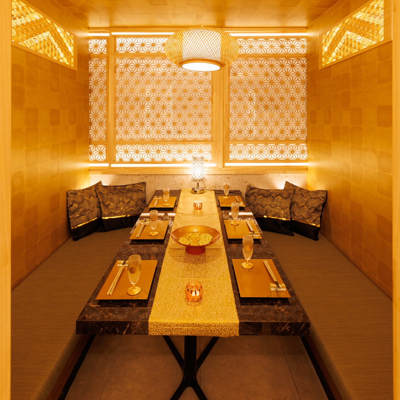 店内は「金」を基調としたデザインで全席個室をご用意。飛鳥時代から続く伝統技術の『組子』で囲まれた内観は組子からあふれる光で優しく包まれ、まるで光の中にいるような気分を味わえます。