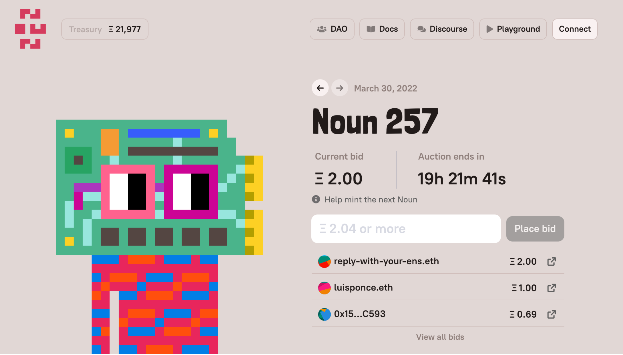毎日1体ずつNounと呼ばれるNFTがランダムに生成され、公式サイト上でオークションにかけられます。競り落とした人がNounの保有者になると同時にNouns DAOのメンバーとなり、DAOの意思決定に参加することが可能になります。