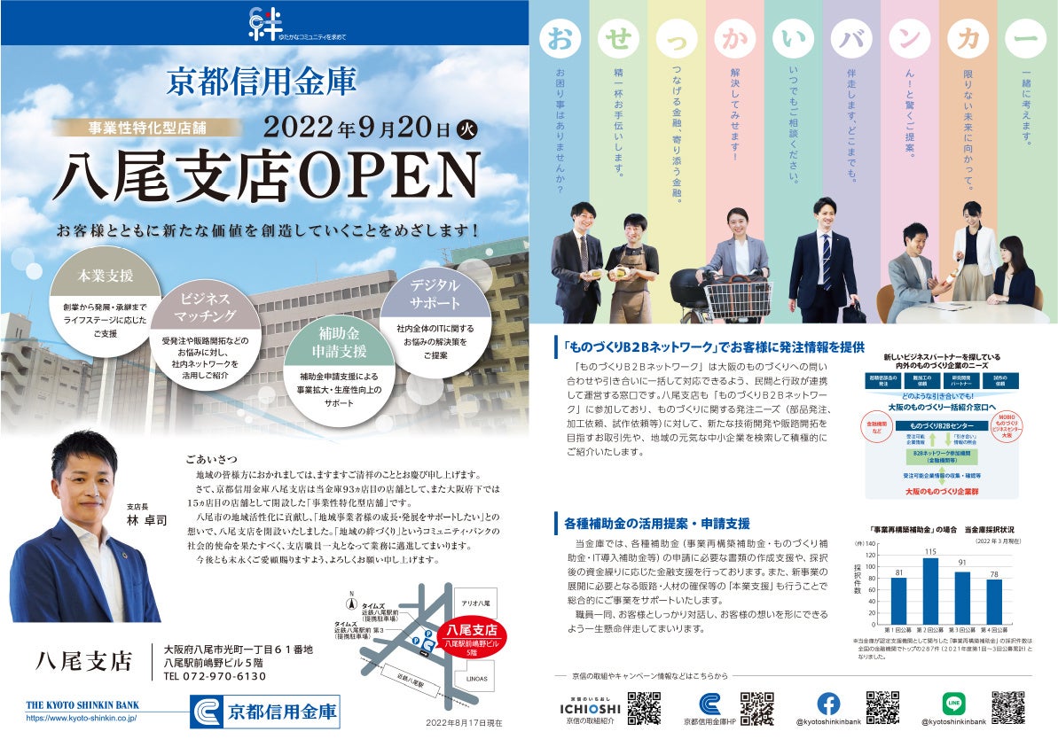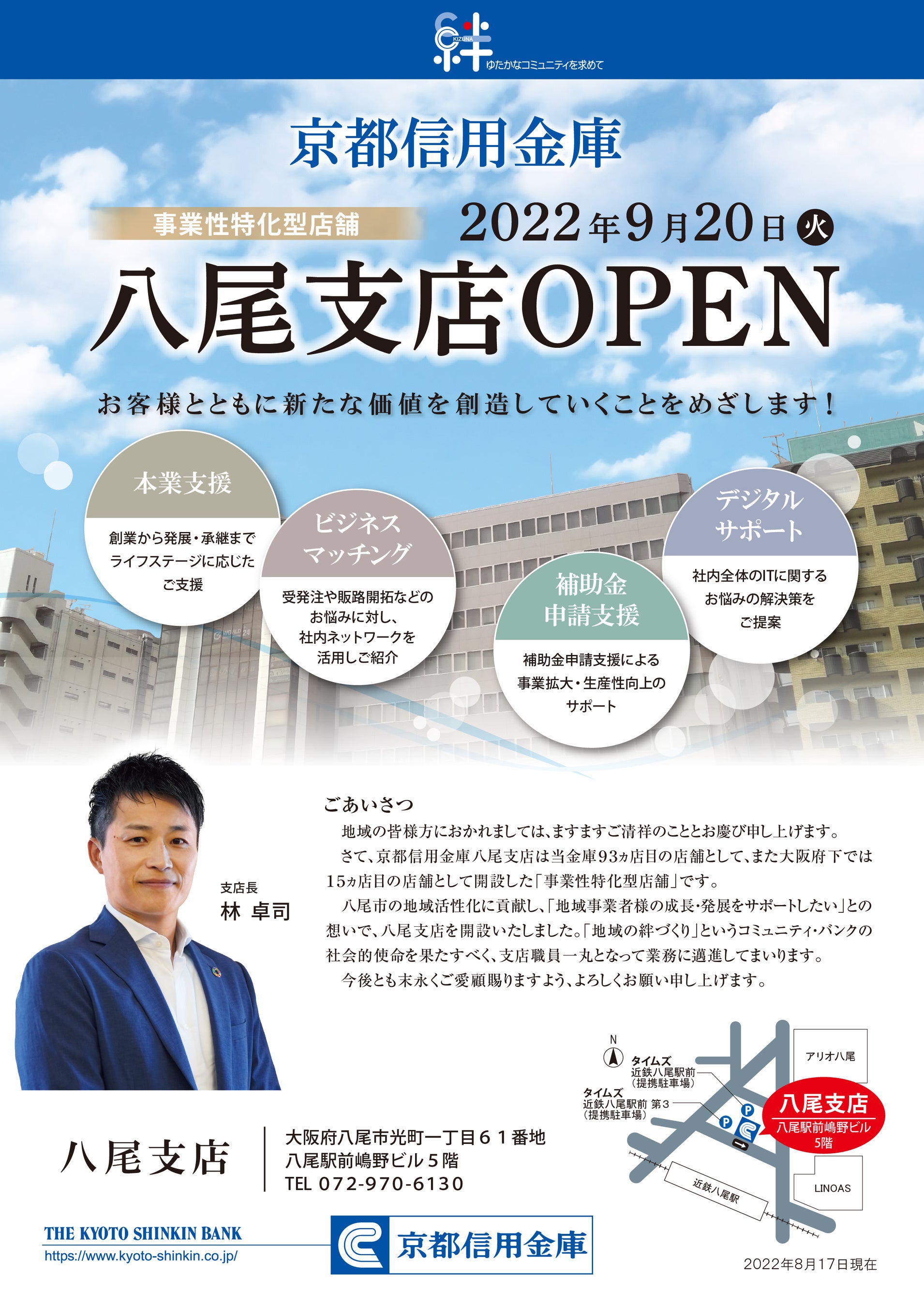 京都信用金庫(本店:京都市下京区、理事長:榊田 隆之)は、2022年9月20日(火)に、「八尾支店」をオープンしました。