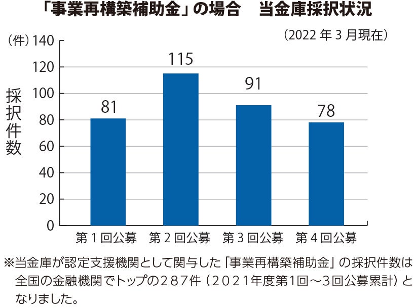 各種補助金(事業再構築補助金・ものづくり補助金・IT導入補助金等)の申請に必要な書類の作成支援や、採択後の資金繰りに応じた金融支援を行っています。また、新事業の展開に必要となる販路・人材の確保等の「本業支援」も行うことで、総合的にご事業をサポートします。