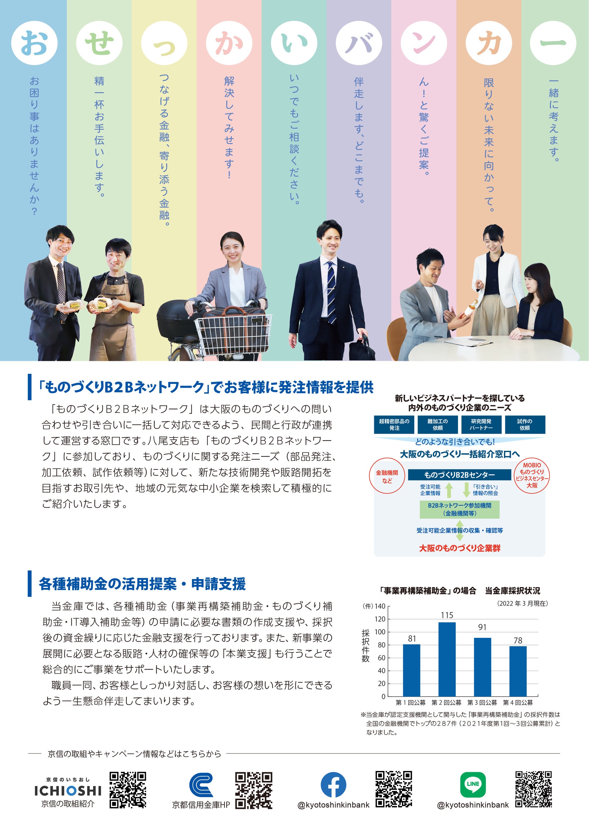 八尾支店においては、京都・滋賀・北大阪に店舗網を持つ当金庫のネットワークを活かし、各地域の企業同士のビジネスマッチングを積極的に推進します。また、「おせっかいバンカー」として企業の課題解決に「おせっかい」を焼き、プロジェクト組成や補助金申請支援といったソリューションによってビジネスの成長・発展をサポートすることで、お客様とともに新たな価値を創造してまいります。