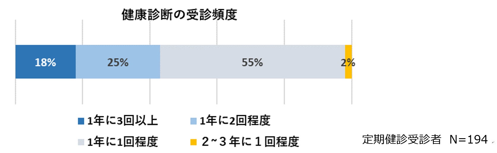 □ 定期的な健康診断の受診頻度は、1年に1回程度が55%を占める。1年に2回程度が25%、1年に3回以上は18%。1年に2回以上が43%を占め、2016年と比べて7ポイント増加し、歳をとるのが早い犬や猫に適切な頻度での受診が増えている。