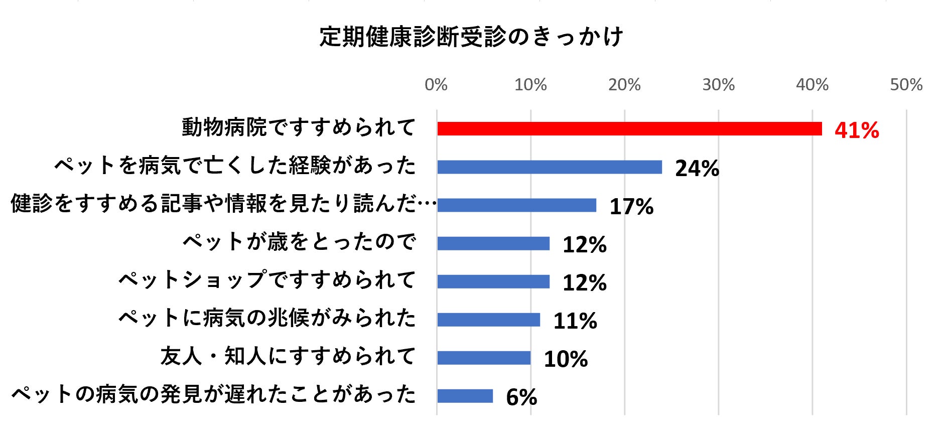 ●受診のきっかけは、「動物病院ですすめられて」が50%と圧倒的に多い。ワクチン接種やフィラリア予防でその際にすすめられたのがきっかけになったと考えられ、動物病院による健康診断啓発の成果があがっている。