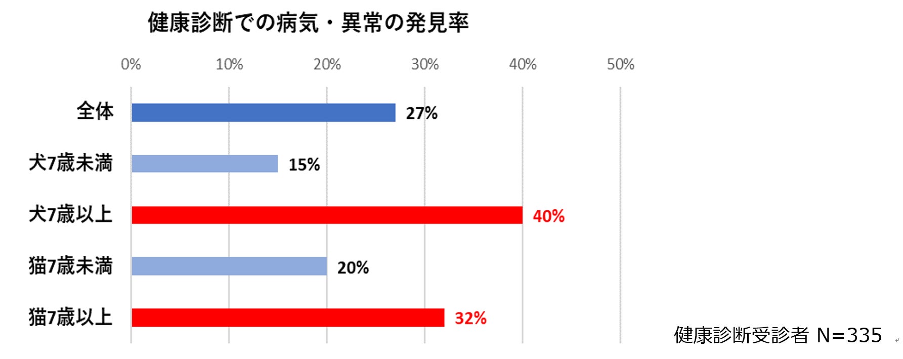 ●健康診断で病気や異常が見つかった経験は27%。7歳以上では、犬40%、猫32%が見つかっており、リスクが高まるため、若い年齢からの健康診断受診による早期発見が重要。