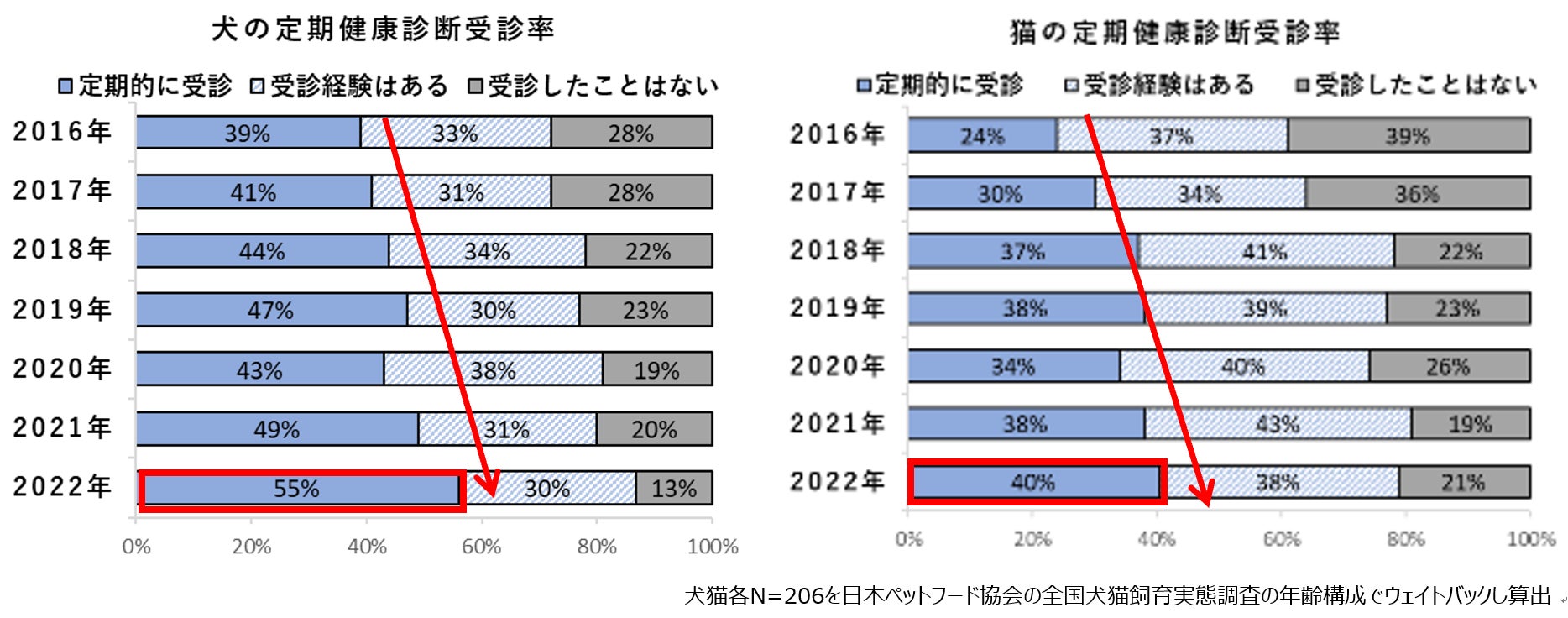 犬は55%、猫は40%がが定期健康診断を受診。ご家族の健康意識が高まり、お金をかけて健康診断を受診させる考え方が定着。