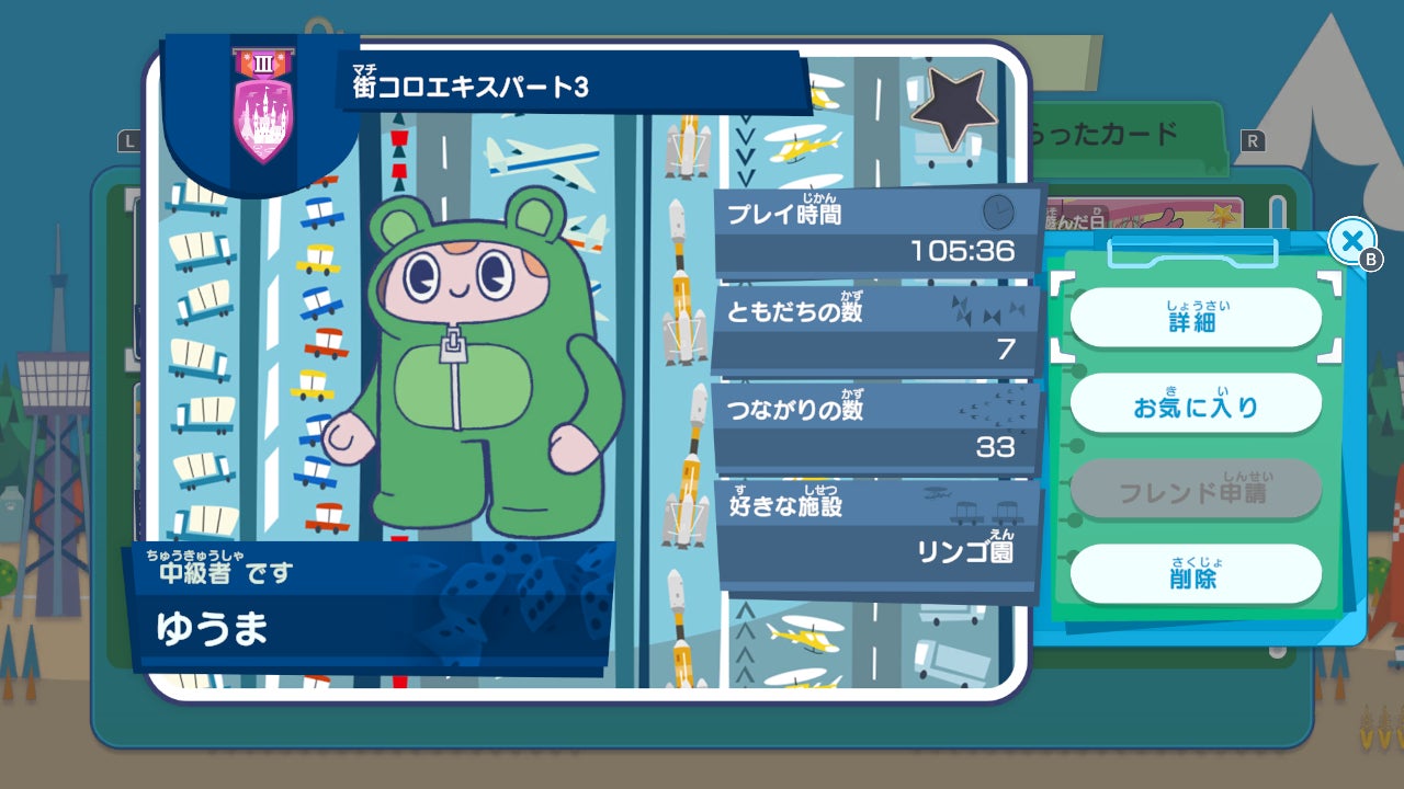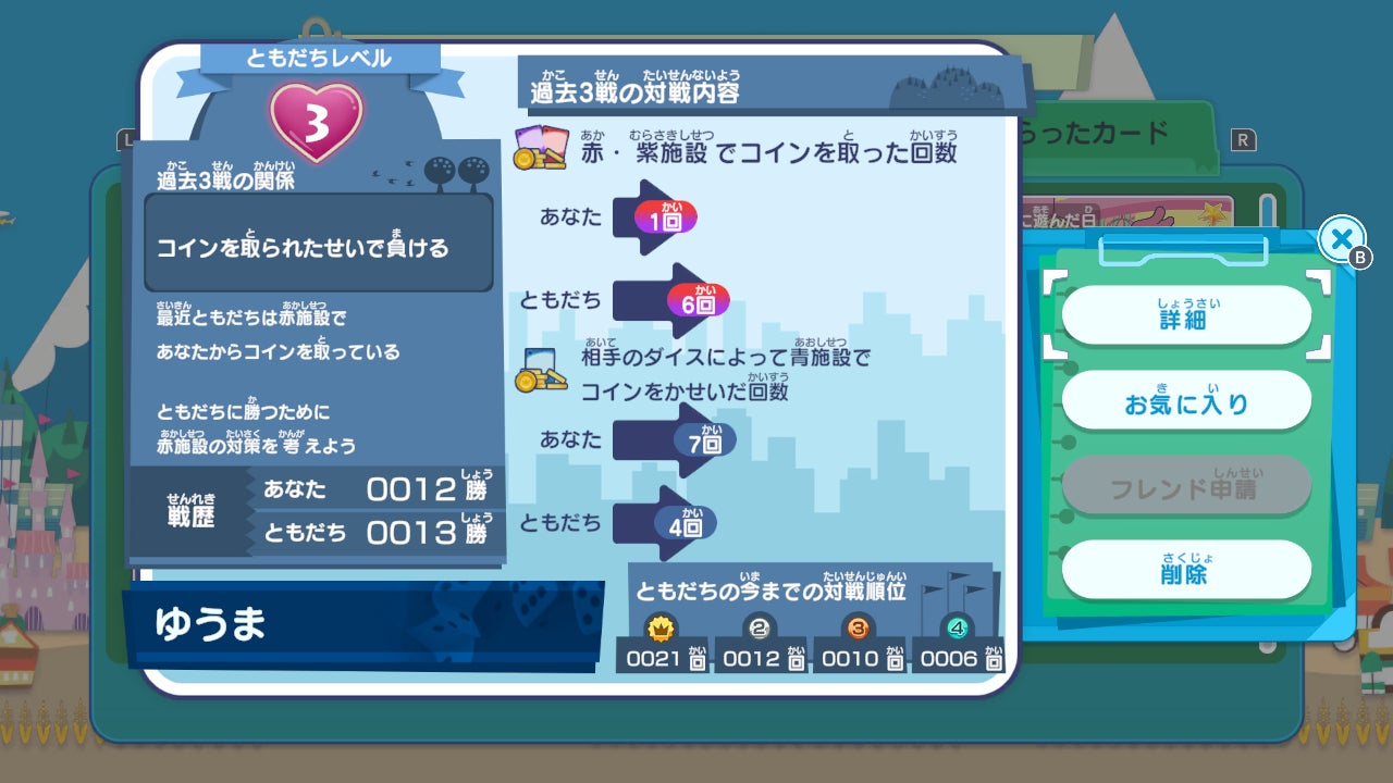 同じともだちと一定回数以上遊ぶと、そのともだちの勝敗、購入した施設の傾向が反映された、 CPU の「分身」がオフラインの一人プレイモードで対戦相手として選べるようになります。