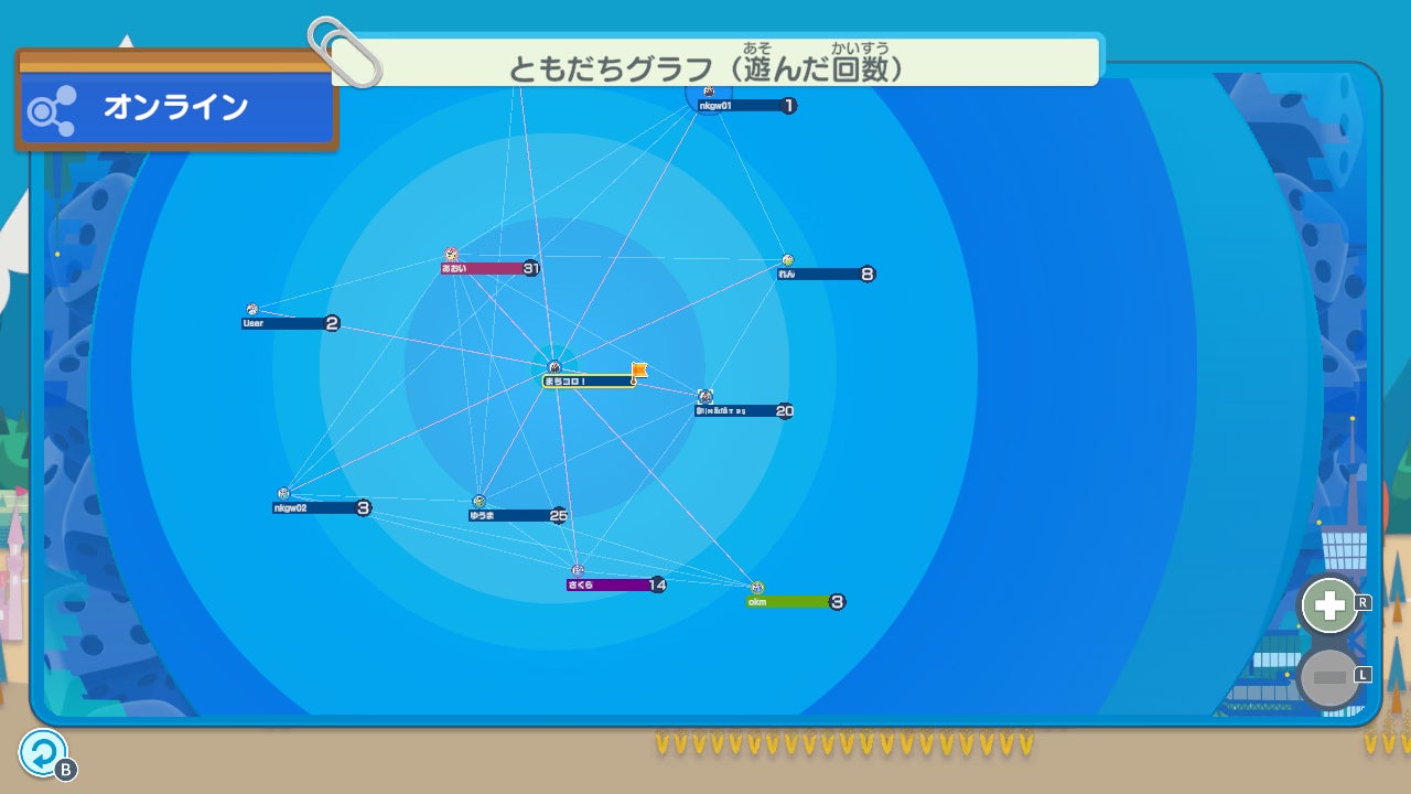 「ともだち」と「ともだち」の「ともだち」まで表示され、遊んだ回数や「ともだち」間のつながりがわかります。