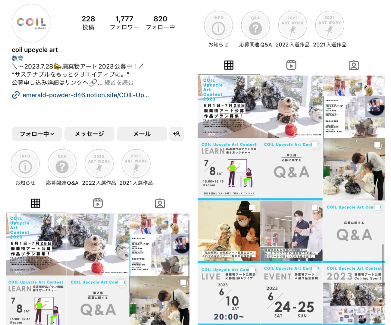 第3回目となる「COIL Upcycle Art Contest 2023」では新たに「価値創造合戦フィールド」というコンセプトを掲げ、募集するアーティスト層の拡大と、一般投票で決まるオーディエンス賞の新設により、サステナビリティというテーマの元で多様なアーティストたちが作品を発表し、オーディエンスがさらに楽しみながら気づきを得ることができる取り組みとして、今後もさらなる拡大を目指します。