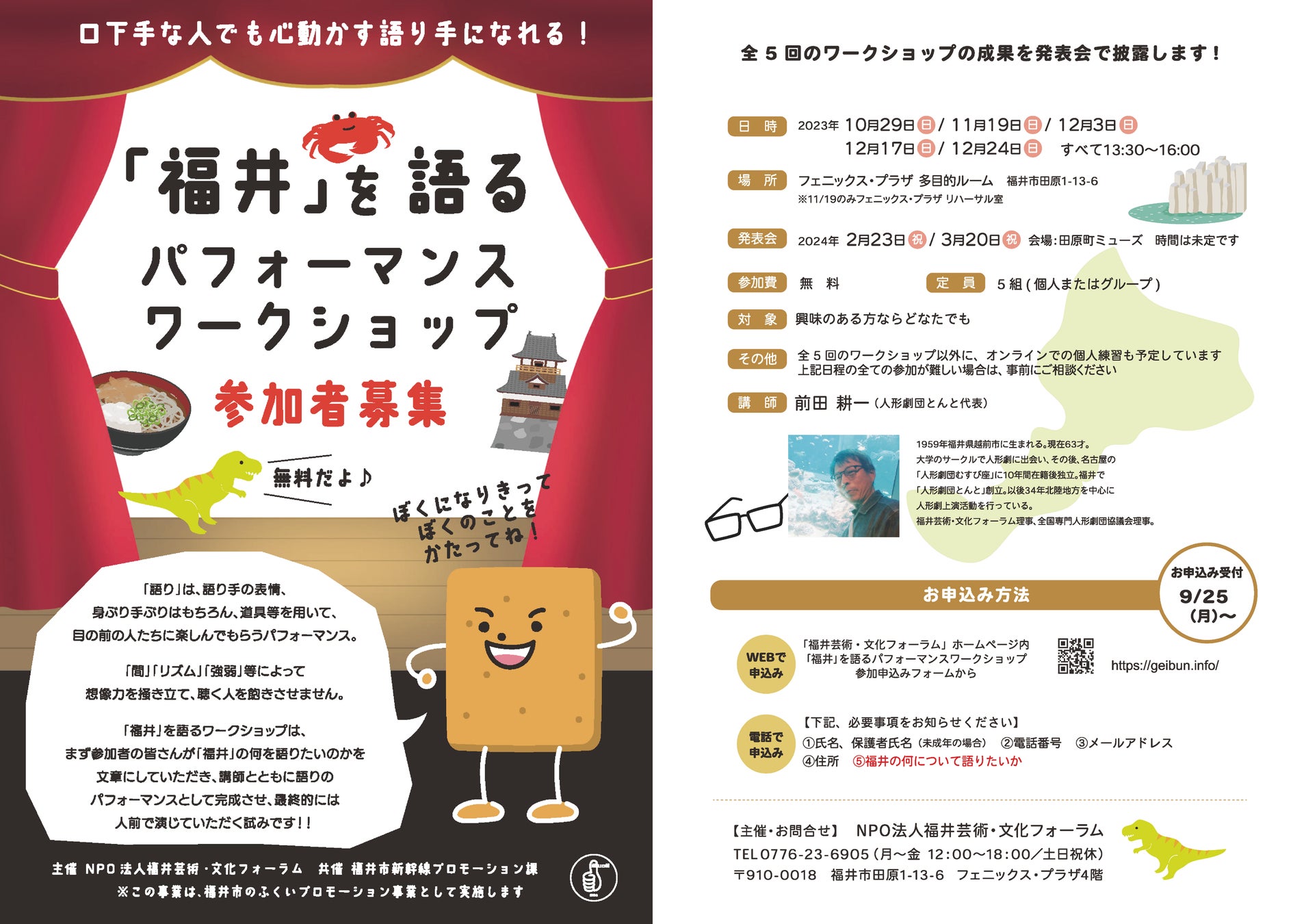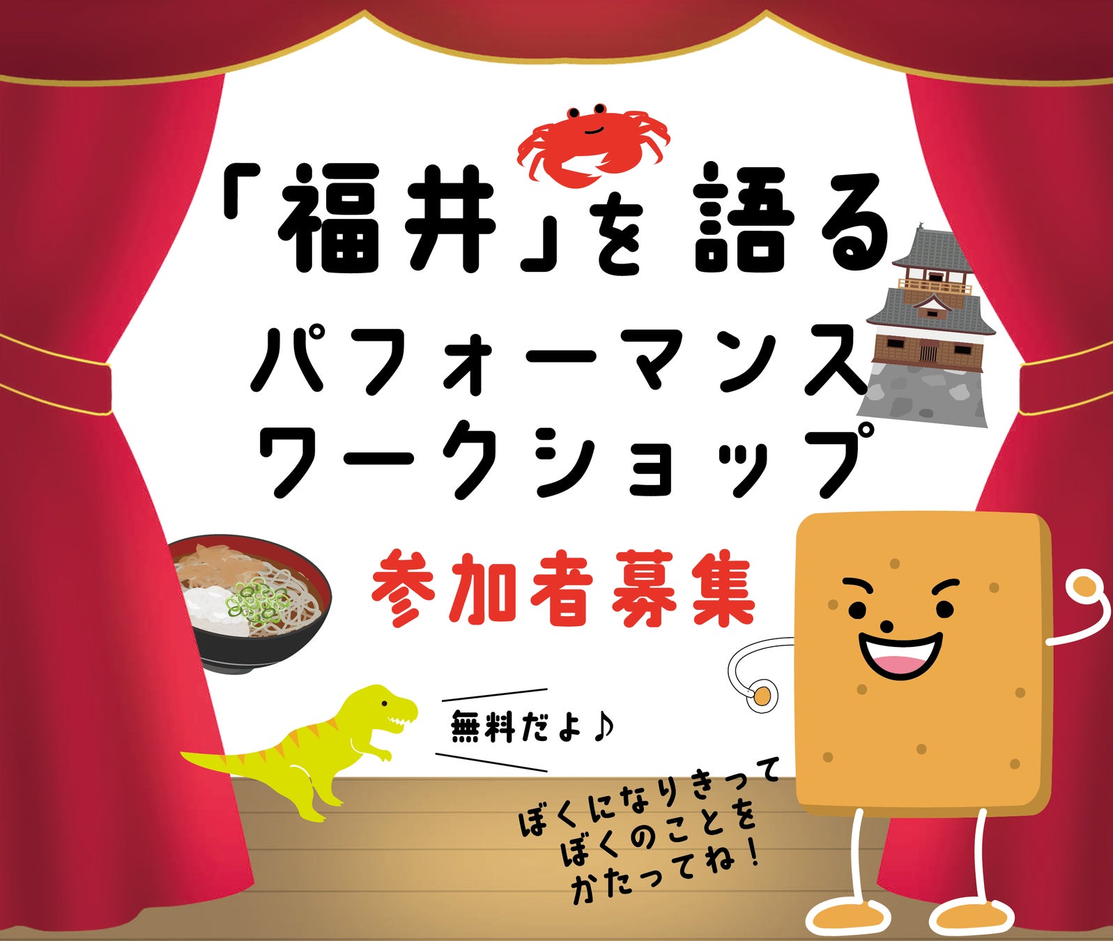 福井市は、NPO法人福井芸術・文化フォーラムと共同して、”「福井」を語るパフォーマンス ワークショップ”を2023年10月29日(日)に開催する。