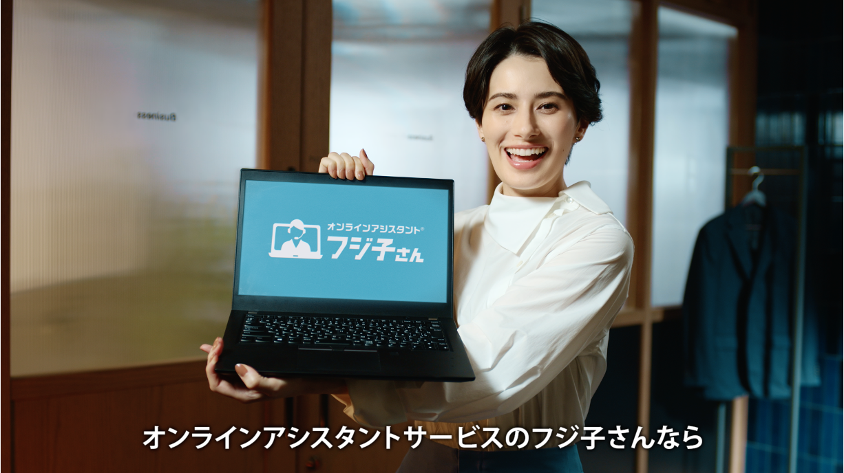 今回のWEB CMでは、⼈⼿不⾜に悩む社長とノンコア業務に追われる社員たちを前に、ホラン千秋さんがPC画面から突如登場。オンラインアシスタントに扮したホラン千秋さんが、経費精算や営業リサーチなど様々な業務の効率化に役立つ「フジ子さん」の特長を分かりやすく紹介していきます。オンラインアシスタントサービスのフジ子さんなら「どんな業務も優秀なアシスタントに頼み放題、低コストで人手不足を解決します!」と社員達を驚かせるシーンが見どころです。