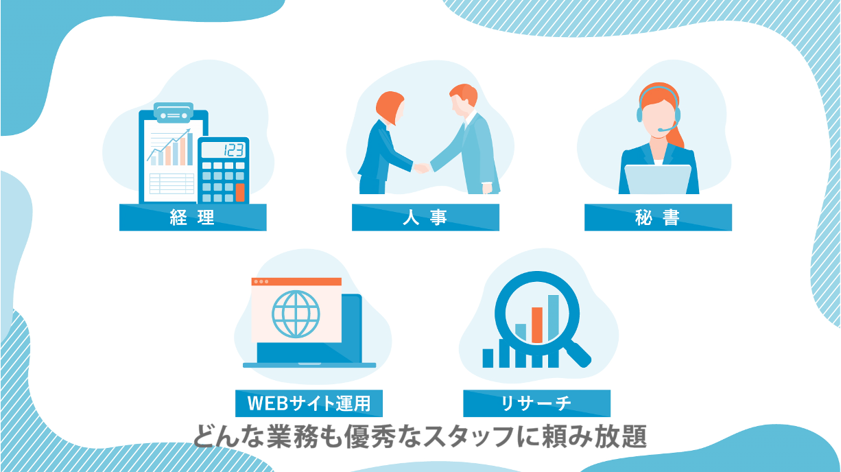 オンラインアシスタント「フジ子さん®」は、実務経験豊富なアシスタント、経理や総務を始め、コール業務など、様々なバックオフィスの業務を遠隔でサポート。企業の⼀般的なアシスタント業務から、翻訳やWebサイト運用などの経験が必要な業務まで幅広いご依頼が可能です。