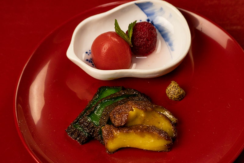 小鉢はトマトを蜜煮にし山桃も添え、冷やして提供します。造り変りは麩善の生麩を焼き、甘辛いタレでまとめました。
