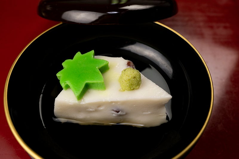 胡麻豆腐はあえて、今朝練りたてのものをご用意いたしました。練りたての胡麻豆腐はコシも香りも違います。三角に小豆がのった京都の水無月菓子に見立てた水無月豆腐です。