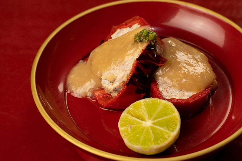 新鮮なパプリカはあゆみ農園のものを使用。高野山・堀畑豆腐の木綿豆腐を絞り、けんちんを詰めて、金山寺味噌をソースがわりにし、西 仁さんの実山椒を添えました。