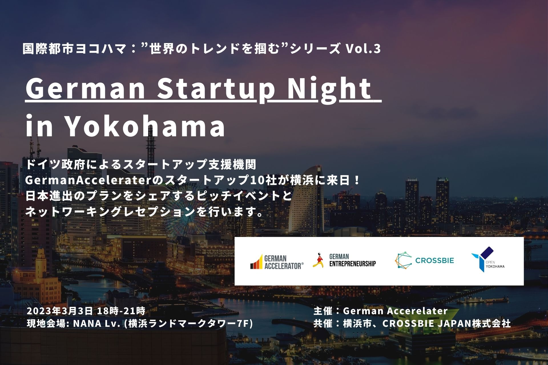 国際都市ヨコハマ『世界のトレンドを掴む』シリーズの第3回は、ドイツ政府によるスタートアップ支援機関German Acceleratorからスタートアップ10社をお招きしてGerman Startup Night in Yokohamaを開催いたします。イベント後には、German Acceleratorのプログラムディレクターやスタートアッ プとの交流の機会としてネットワーキングレセプションも行われます。