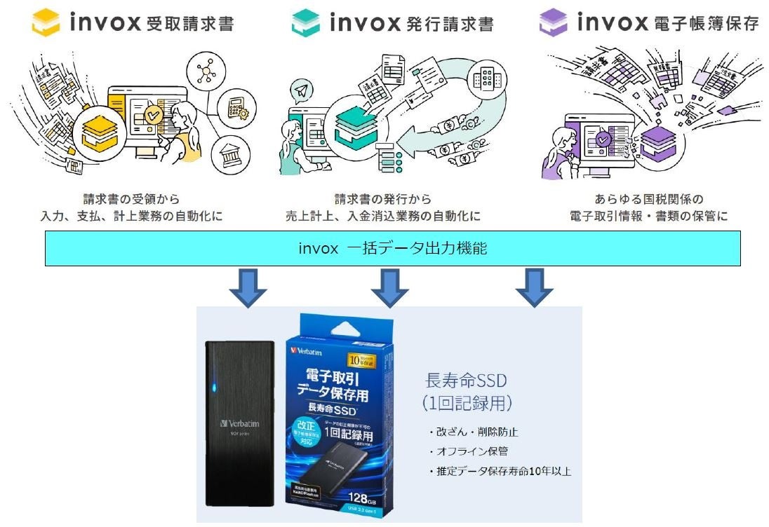 invox 受取請求書、 invox 発行請求書、 invox 電子帳簿保存などの 、経理業務を自動化するクラウドサービスを紹介すると共に 、当社の1回記録用長寿命SSDなどのストレージ製品との積極的な連携を図って参ります。