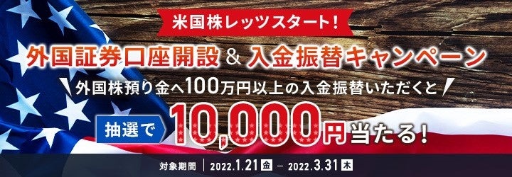 | 内容 | 外国証券口座開設、各種書面に同意する手続きをしていただき、さらに外国証券取引口座へ100万円以上の入金振替をしていただいた方には抽選で100名様に10,000円をプレゼントいたします。 サービス開始(入金振替、お取引等)は2022年1月24日(月)から、口座開設受付開始は2022年1月23日(日)システムメンテナンス完了後からとなります。 エントリーは2022年1月21日(金)から可能です。※エントリーは対象期間内であれば入金振替の前後を問いません。 |