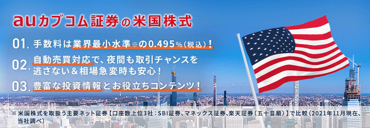 auカブコム証券の米国株式取引手数料は業界最小水準の0.495%(税込)!為替スプレッドも1ドルあたり20銭と、比較的低コストでのお取引が可能となっております。