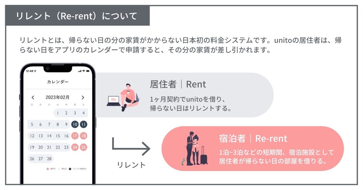 本物件は、帰らなかった日数に応じて家賃が減額される新しい家賃システム「リレント」を採用しています。入居者が、帰らない日の部屋をさらに宿泊施設として短期宿泊者に貸し出す(Re-Rent)ことで、家を使ってない日の家賃を節約することができます。