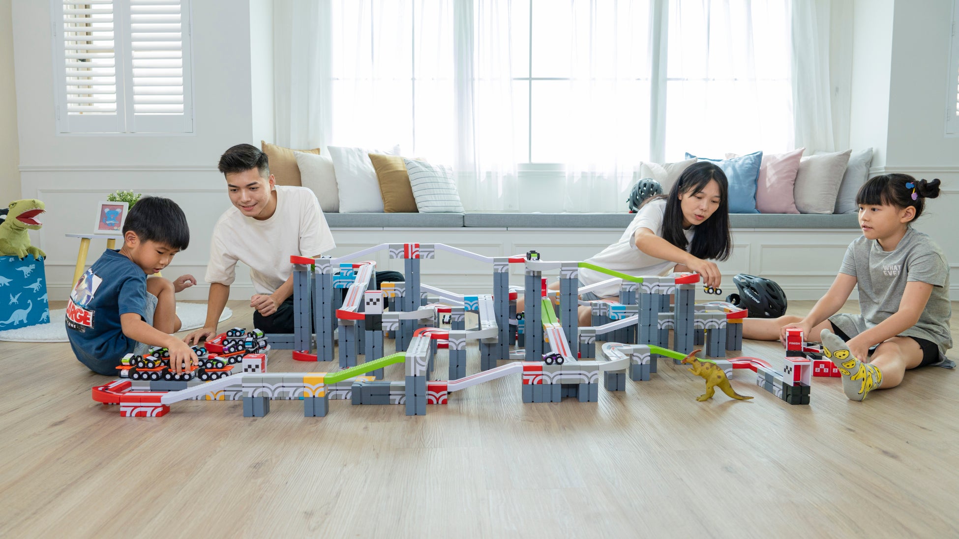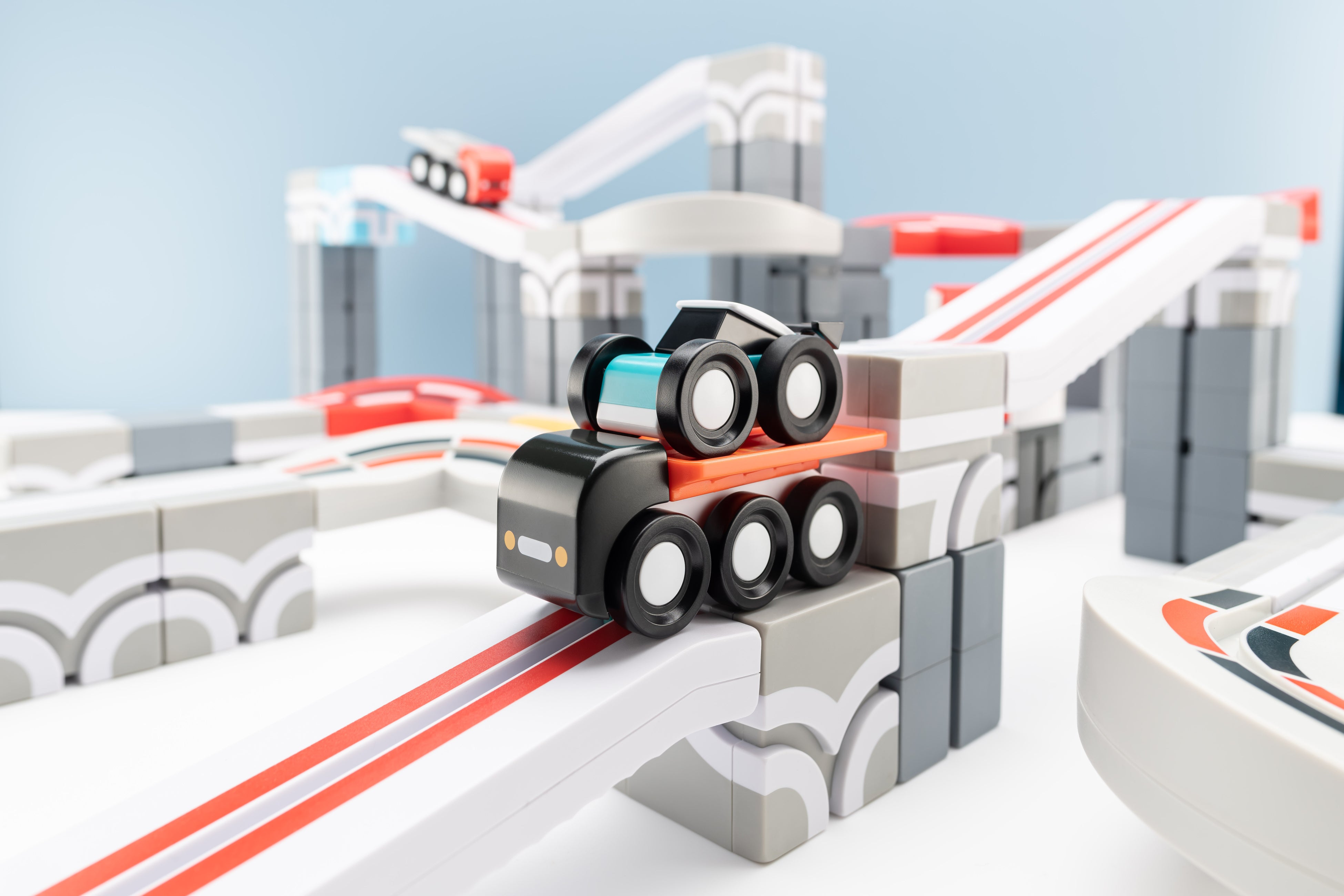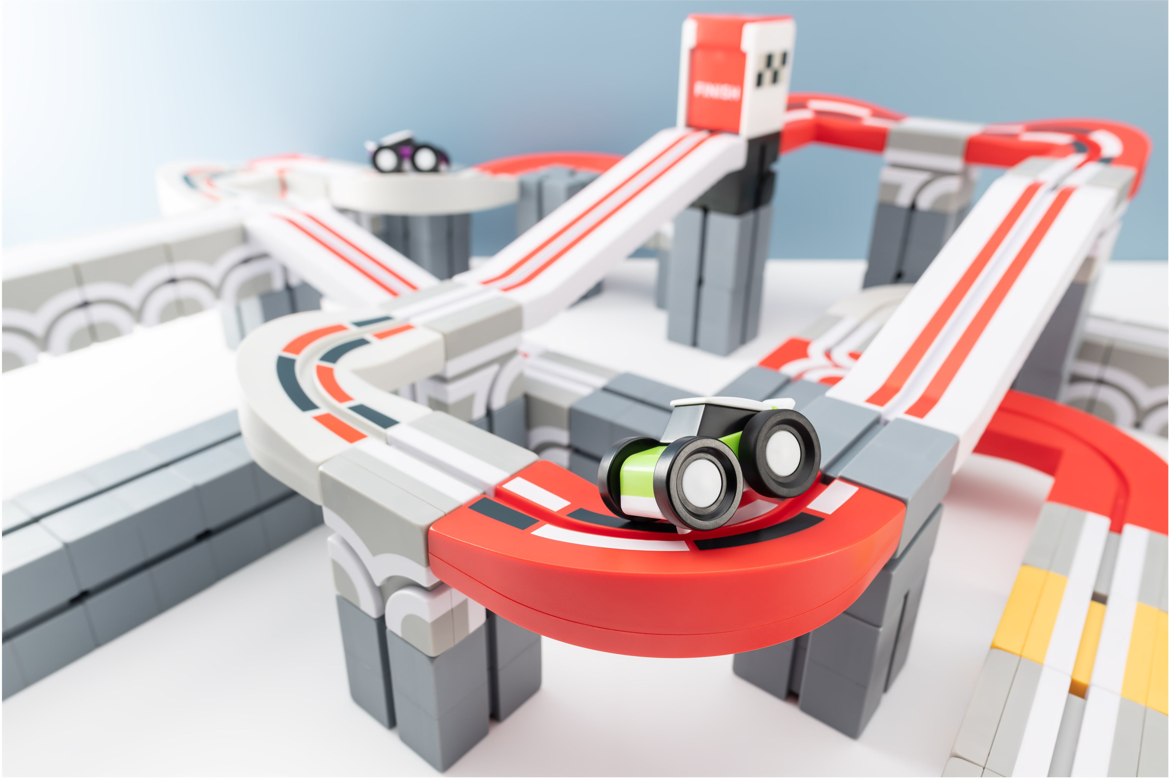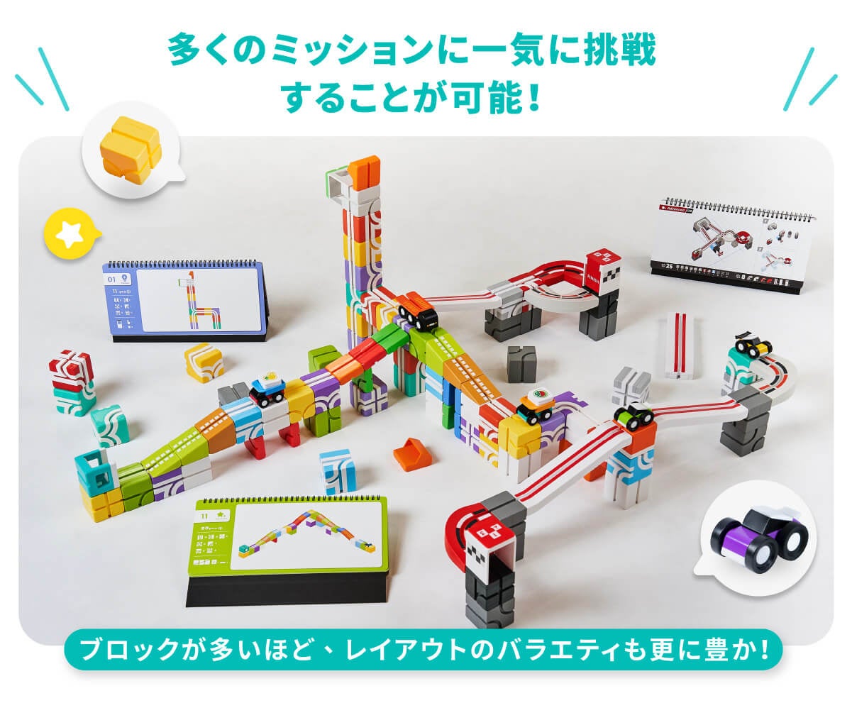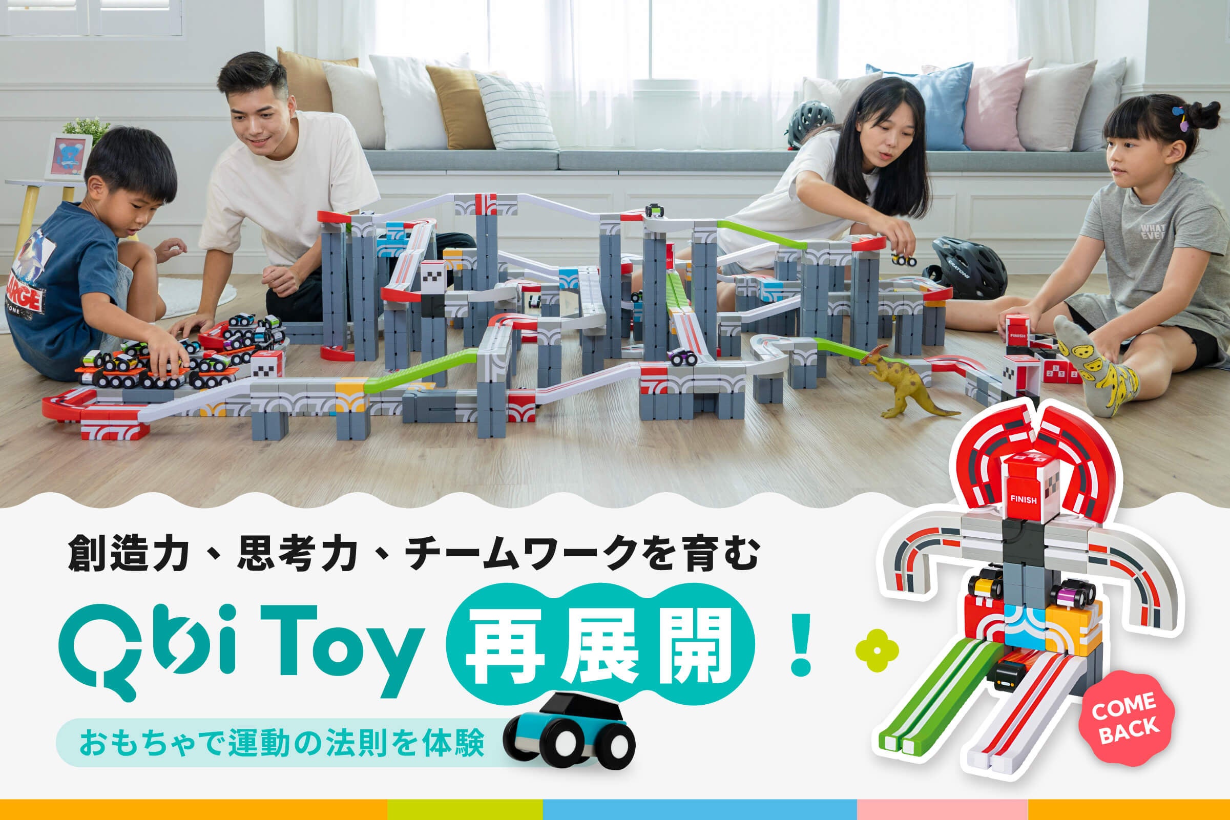 ブロック・レール・ミニカーが全て入って、0歳児から大人まで楽しめるおもちゃ『Qbi Toy』。遊びながら、関心の高まってきたプログラミング思考が育まれます。この度、重力や加速度の体験できるアイテムが新作のレースセットに導入され、過去シリーズと組み合わせてコースをレベルアップしましょう!