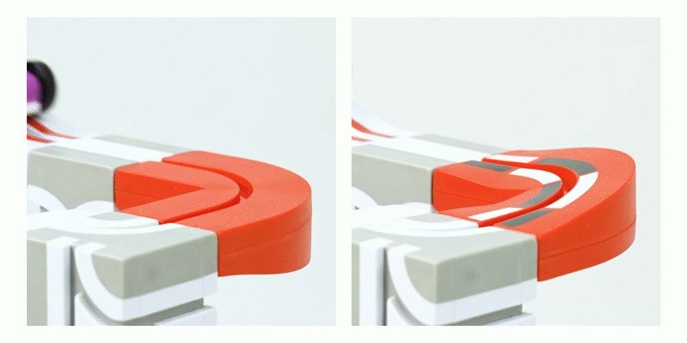 ブロックの6つの面に、直線・交差点・カーブ・分岐などの溝が掘られているため、どっちの面同士をくっつければ、思ったレイアウトが作れるのだろうという想像が子供の脳内に何度もめぐります。実際に組み立てみると、「あれ?思った方向に行かない?」という時もあるでしょう。こういうことで、試行錯誤で方法を探すことにより、遊びながら、プログラミング思考力を養うことを可能にしました。