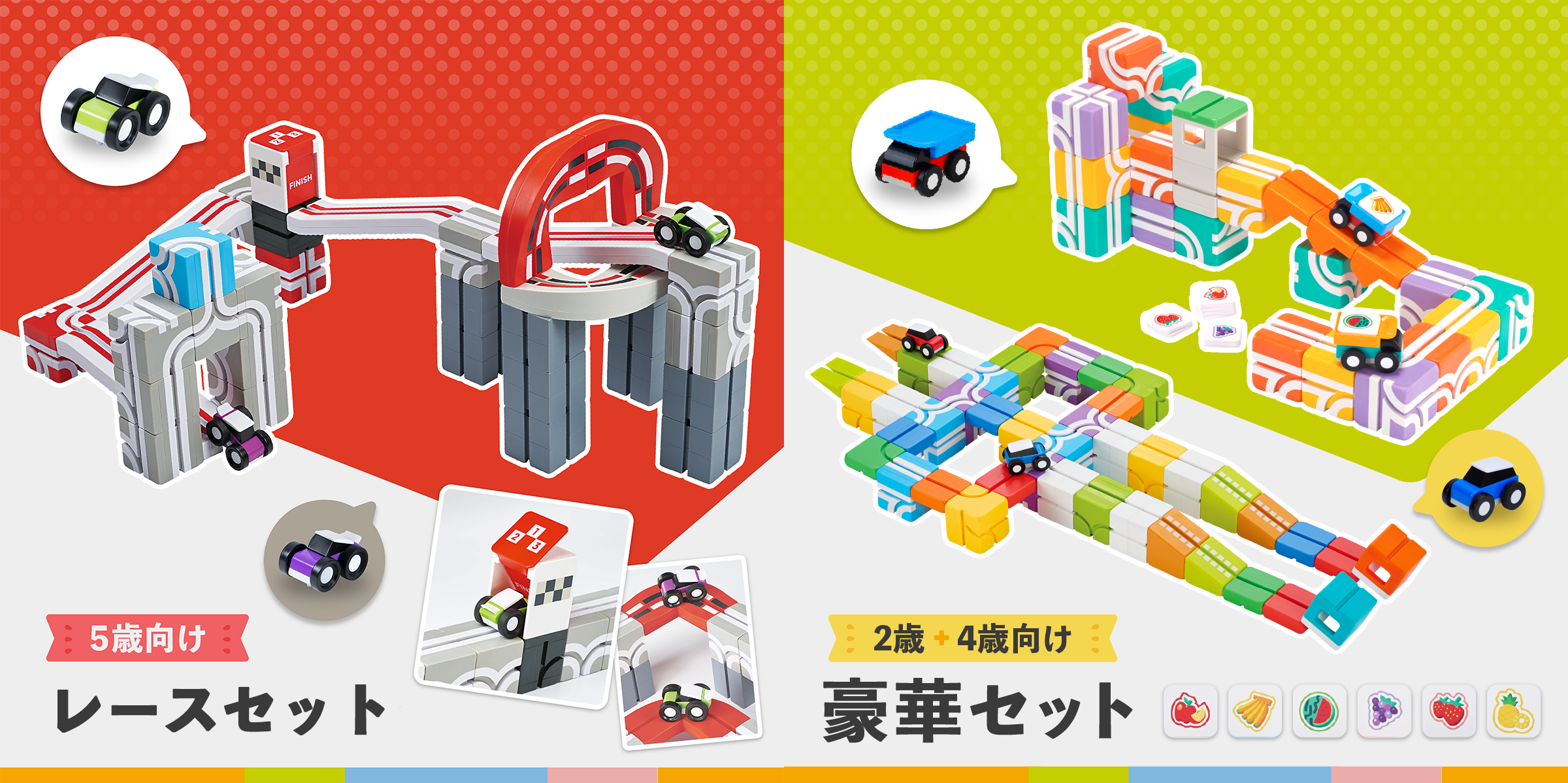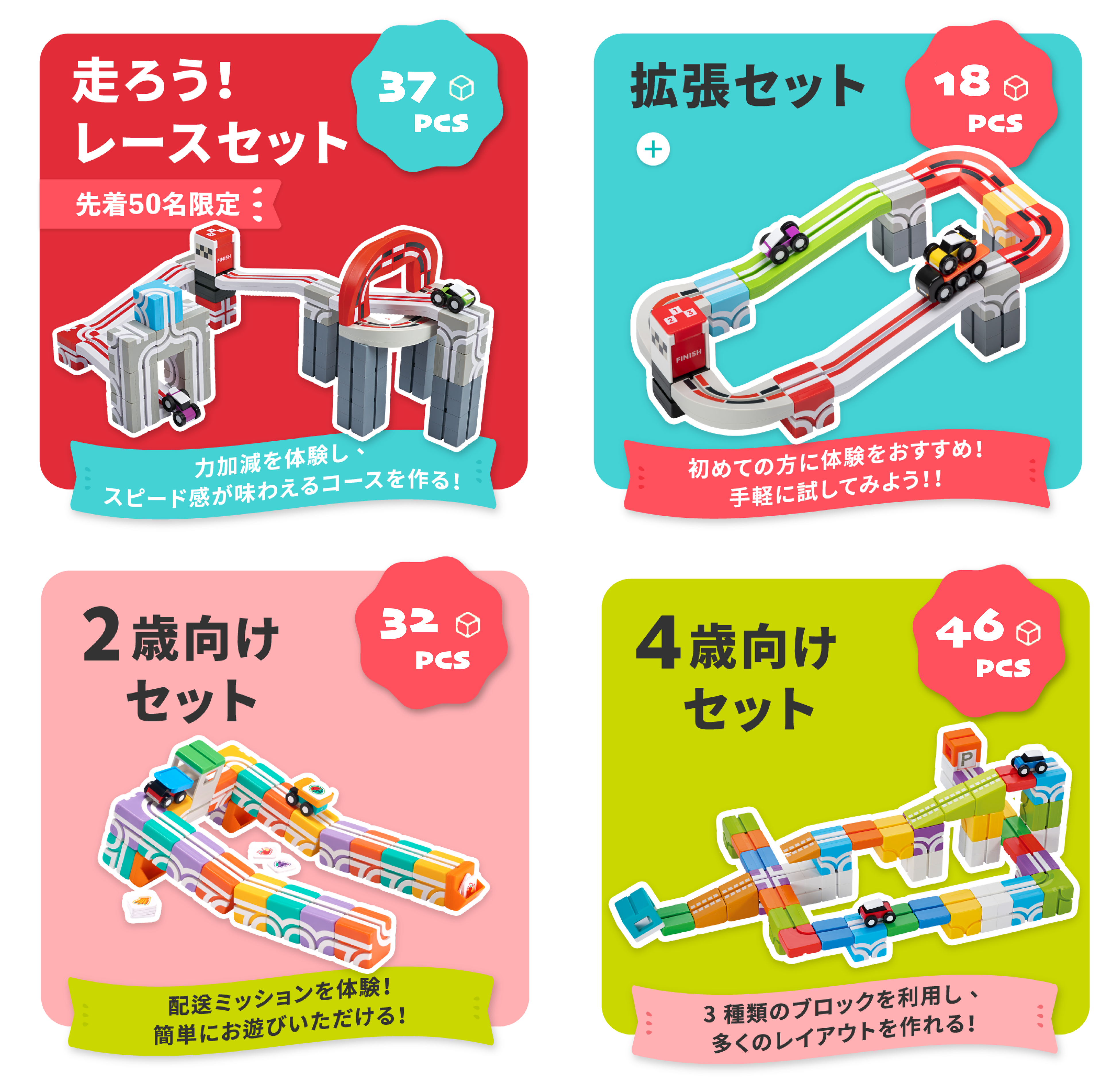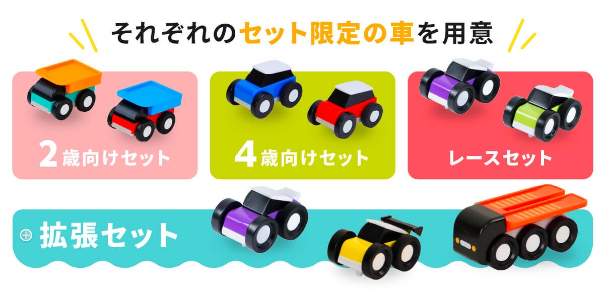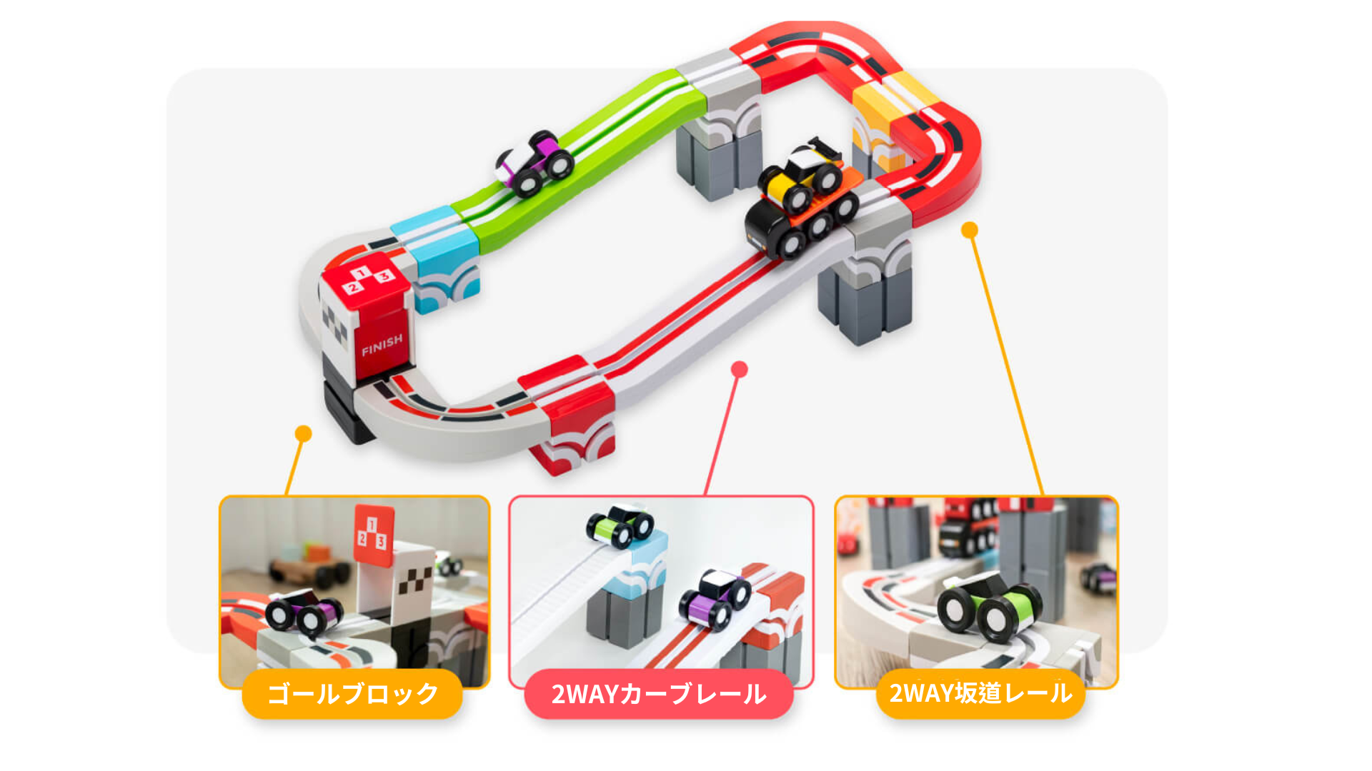 各セットには限定の車を用意しており、物理の概念を含んだミニカーを存分に楽しく遊べます。ミニカーを走らせるため、こどもの物を握る力も自然にトレーニングすることが出来ます。