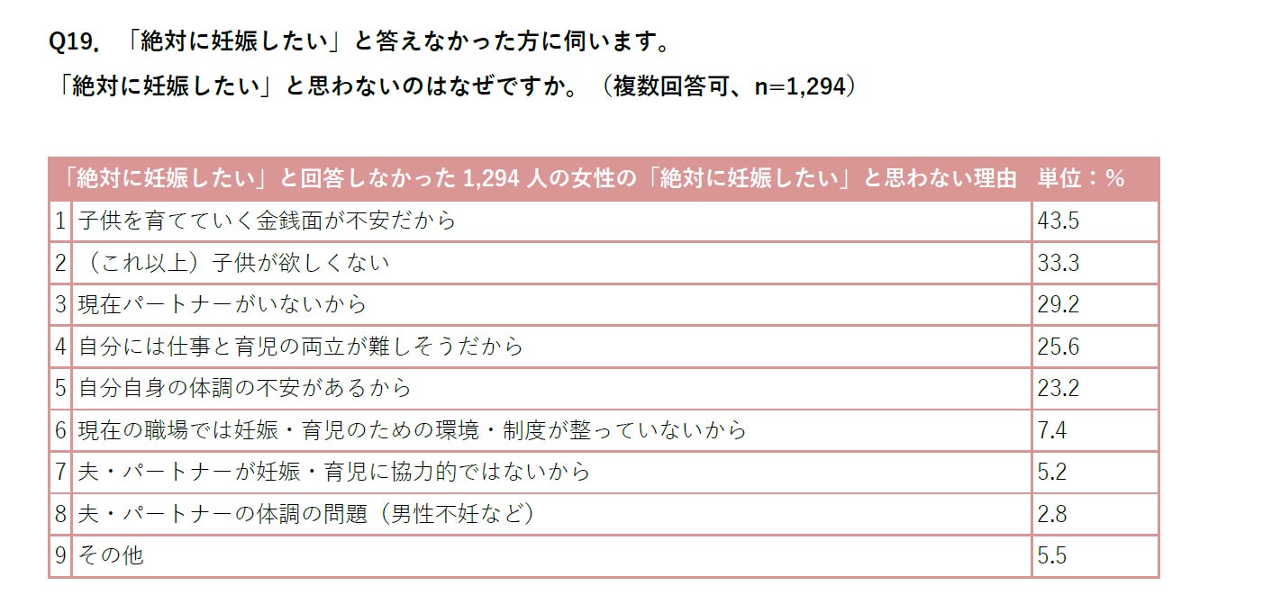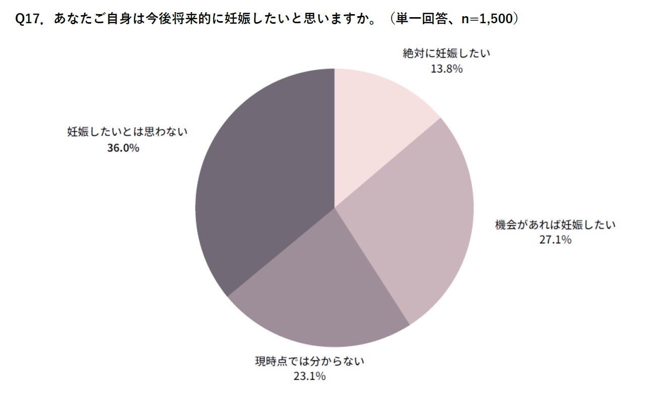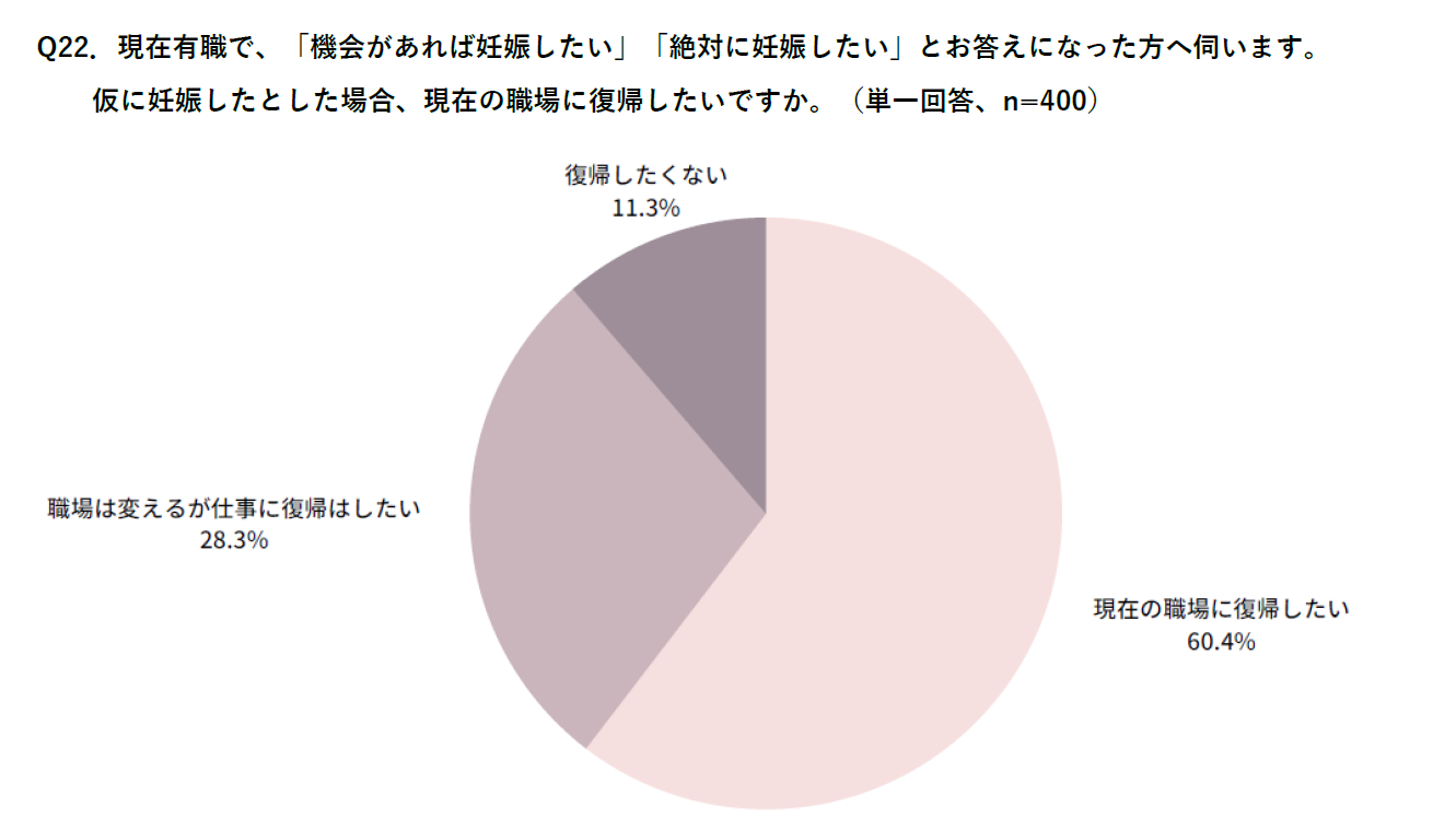 妊娠を望む女性は全体の40.9%で、働く女性のうち88.7%が「仕事に復帰したい」と回答。子育てをしながら働くイメージを持つ女性が昨年よりも増加傾向に。