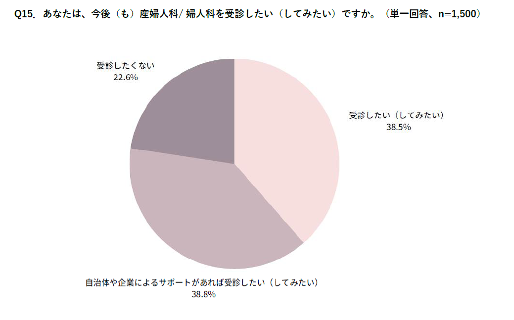 妊娠経験のない女性のなかで、産婦人科/婦人科へ一度も受診したことのない方は44.7%。受診していない理由の多くは、昨年同様「お金がかかる」「それほどの体調の不具合/問題とは思っていない」「内診が嫌」など。一方で、「受診したい(してみたい)」女性は全体の77.4%。受診意欲はあるものの、心理的金銭的ハードルが依然と高いことが見受けられる。
