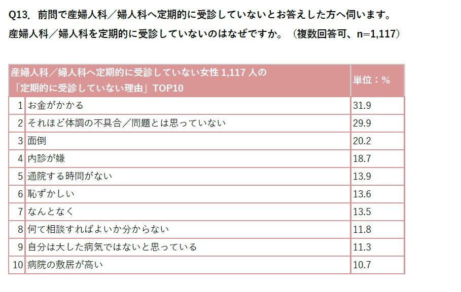 ☑定期的に受診しない理由は「お金がかかる(31.9%)」「それほど体調の不具合/問題とは思っていない(29.9%)」「面倒(20.2%)」「内診が嫌(18.7%)」と、昨年と大きく変わらない。一方で、産婦人科/婦人科を受診したい(してみたい)女性は77.4%。