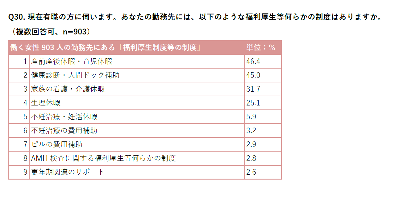 ☑勤務先の福利厚生制度で「産前産後休暇・育児休暇」「健康診断・人間ドック補助」「家族の看護・介護休暇」が充実している勤務先は多いが、生理や不妊治療などウィメンズヘルスケアに関する制度はまだまだ導入の余地があるといえる。