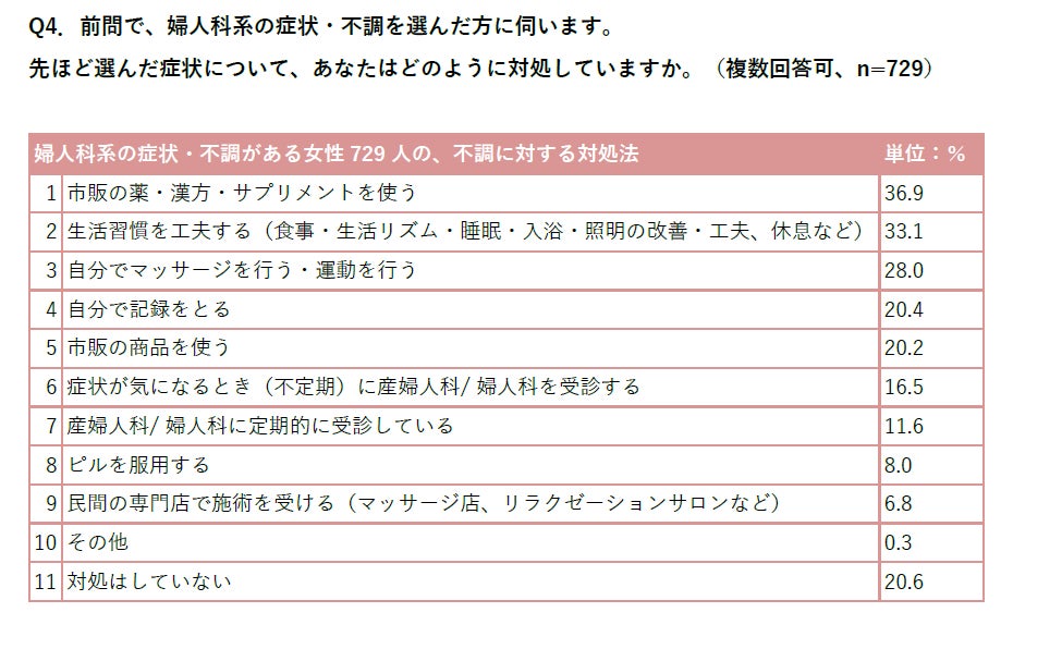 婦人科系の不調に対して、クリニックを受診せず自己対処している女性が多くみられます。全く対処していない人も5分の1程度いることに産婦人科医として危機感を感じます。大切なひとのため、そして自分のために、少しでも不調を感じたら、忙しくても専門医の診察をうけるようにしていただけたらと思います。